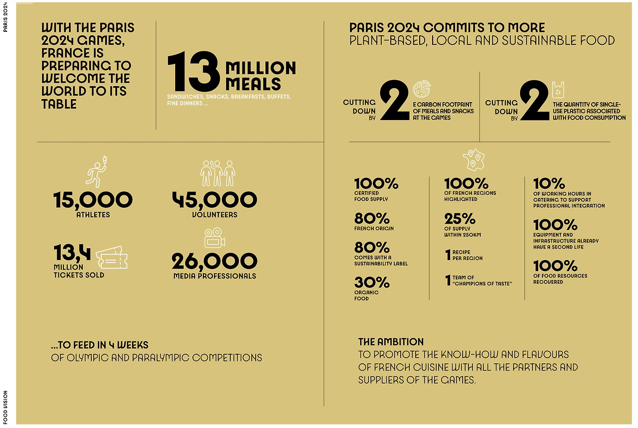 참고로 파리 올림픽은 ‘음식 비전(Food Vision)‘에 관한 백서를 제공한다. 2012 런던 올림픽과 2016 리우 올림픽 대비 탄소발자국을 절반으로 줄이겠다는 목표를 골자로, 채식 식단을 늘리고 식재료 80%를 프랑스 내에서 조달하고 플라스틱을 줄이고 재사용 가능한 포장재를 늘리겠다는 지속가능함을 목표로 삼았다. 또 프랑스식을 포함한 다양한 음식을 제공하겠다는 취지, 음식물 쓰레기를 줄이고 남은 음식은 재분배하거나 퇴비화해서 활용하겠다는 계획을 담았다.