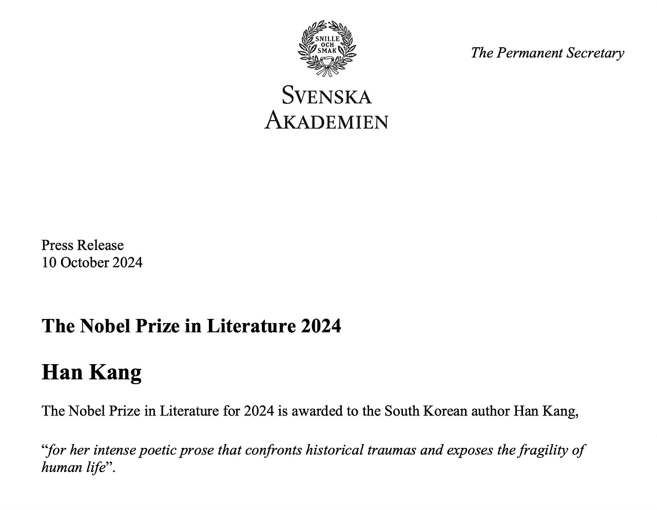 * 나라는 난리가 났고, 사람들은 노벨문학상 수상의 의미를 온갖 언어를 동원해 표현했고, 예상할 수 있듯 여러 다양한 맥락에서 폄하하거나 삼척동자도 아는 노벨상의 권위와 상징성을 느닷없이 낯설게 하는 이들도 나타났다. 그러나 "역사적 상처에 맞서며 인간 삶의 연약함을 드러내는 강력한 시적 산문”이라는 한림원의 짧고 단단한 심사평은 한국사람들이 원어로 된 노벨문학상 수상자의 작품을 읽게 됐다는 확증을 주기에 충분했다.