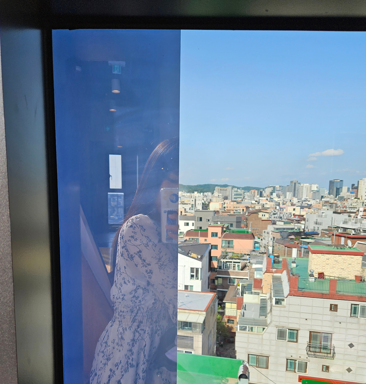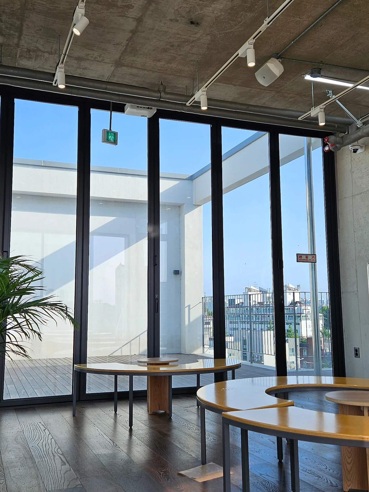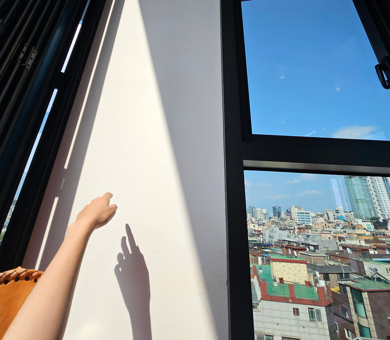 폴딩도어 너머 테라스의 회백색 벽 위로 조도 낮은 그림자가 드리웠다. 하늘에 떠있는 듯 보이는 항공장애표시구의 빨간 색감이 잘 어울린다고 생각했다. 그 누구도 의도하지 않았지만 절묘해진 하모니를 발견한 듯 들떴다. 구름마저 거의 보이지 않는 맑은 하늘이 한몫 톡톡히 한 풍경이다.