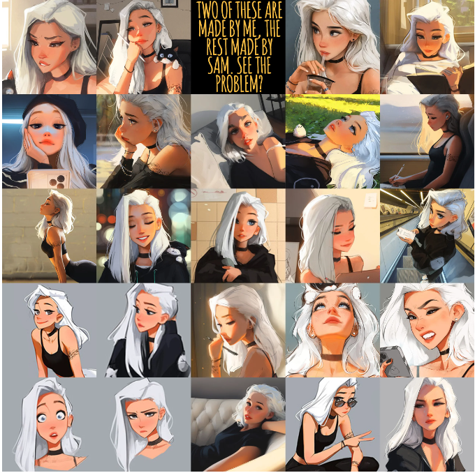 이제는 Sam이 지금까지 그려온 수많은 그림으로 이미 학습이 충분히 된 AI가 언제든 같은 스타일로 그림을 그릴 수 있게 되었으니, Sam은 아티스트로서의 가치를 상실했다고 할 수 있는가, 아니 그것보다도, 많은 사람들이 두려워하고 있는 것처럼 그림도 그리고 글도 쓰고 음악과 동영상까지 뚝딱 만들어내는 AI에 밀려서 이제 인간은 아무런 쓸모가 없는 존재가 되어버리는 걸까?