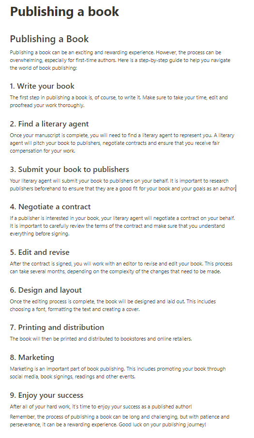 예를 들어 내가 책을 출판하는 것을 생각하고 있다는 가정하에 'Publishing a book'이라고만 쓰고 엔터를 누르자 AI가 단 몇 초 만에 책 출판에 대한 아래와 같은 리스트를 뚝딱 만들어냈다.