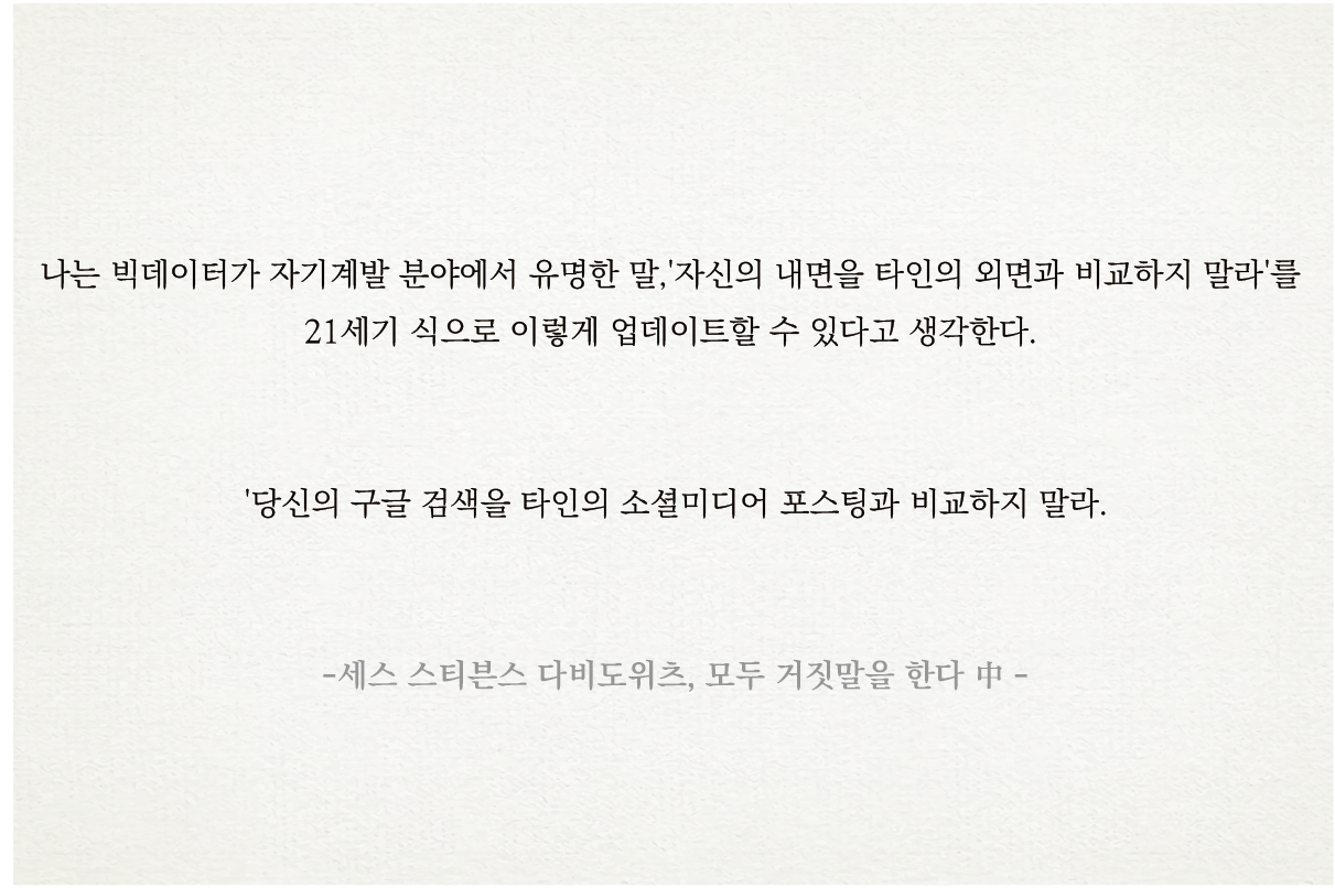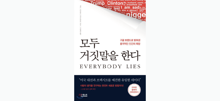 '모두 거짓말을 한다'는 새로운 방식의 통계와 데이터 분석을 제시하는 책이다. 저자는 인터넷 공간에서 생기는 데이터에 가치부여를 한다. 분석하기 쉽고, 때로 그것은 기존의 통계의 한계(피실험자의 거짓말, 설문의 위선)를 넘어서고, 익명의 공간이기에 사람들이 더욱 솔직해진다는 점을 주목한다.