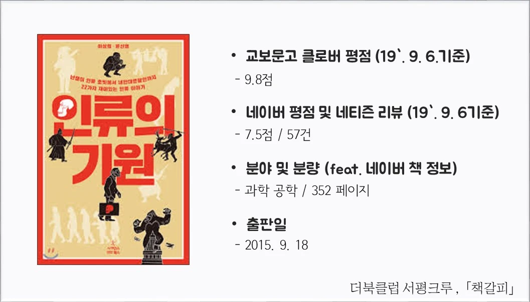 『인류의 기원』에서 반드시 눈여겨봐야 할 점이 기원을 논하는 작업의 의미이다. 책의 제목답게 인간 이전의 사람, 태초의 인류를 다루는데, 바꿔 말하자면 기원에 대한 책이다. 원조란 본디 하나일 텐데 ‘원조’가 횡행하는 시대에 살고 있다는 것은 사이비들이 원조를 참칭하려고 경합하고 있다는 말일 것이다.