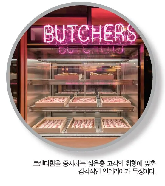또한 불판 대신 연탄불로 조리해 불맛을 강조해 인기를 끌고 있다. 직장인과 학생들이 간편하게 즐길 수 있는 식사메뉴도 이른바 가성비에 주안점을 두었다. 큼직한 생고기가 듬뿍 들어간 생고기김치찌개는 점심시간 베스트셀러. 또 멕시칸 푸드의 일종인 치폴레 소스로 볶아 맛을 낸 돈밥은 새로운 맛을 선호하는 젊은층에서 인기가 많다. 인테리어 또한 젊은층의 취향과 개성을 고려했다. 연기 자욱한 고깃집의 노포 분위기를 생각하면 오산이다. 벽면의 네온사인 캘리그래피 문구는 마치 트렌디한 펍이나 바의 분위기를 연출하고 투명한 쇼케이스에 가지런히 담긴 고기 진열장도 눈에 띈다.