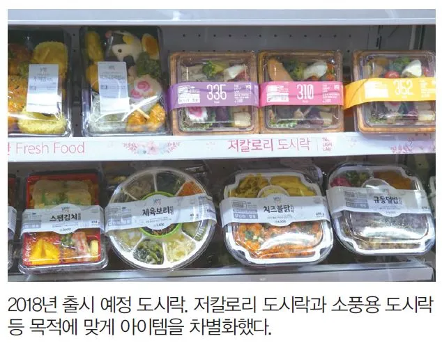 ● 도시락 소비자의 목적에 따라 세분화했다. 다이어터를 위한 저칼로리 도시락과 피크닉도시락이 대표적이다. 저칼로리 도시락은 상품 디자인부터 칼로리를 크게 표시하고 피크닉 도시락은 캐릭터를 활용해 아기자기하게 꾸며 비주얼을 살렸다.