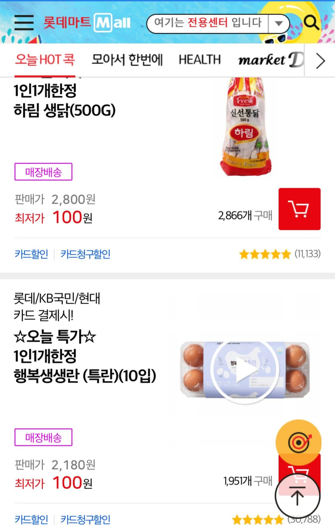 모바일 단독행사 상품 중에서는 ‘오늘 HOT 콕’으로 100원 딜이 뜬다. 모바일 행사지만 매장과 동일한 상품이다. 매장 직매입 상품을 원가매가해 최저가로 만든다. 비록 행사상품은 손해 볼지언정, 미끼 상품으로 효과적이다. 행사시 10% 이상 매출이 높게 나와 온라인 구매객이 많은 점포 점장들은 선호한다. 주로 과일이나 채소, 특히 시즌과일과 시즌채소, 이슈 상품들을 중심으로 행사를 준비한다.