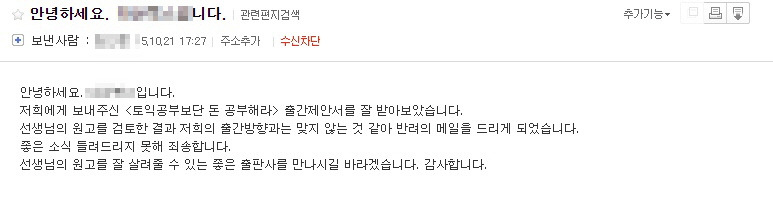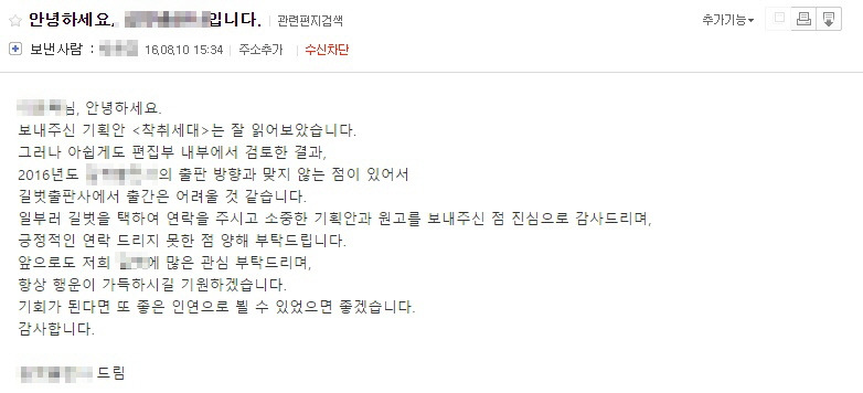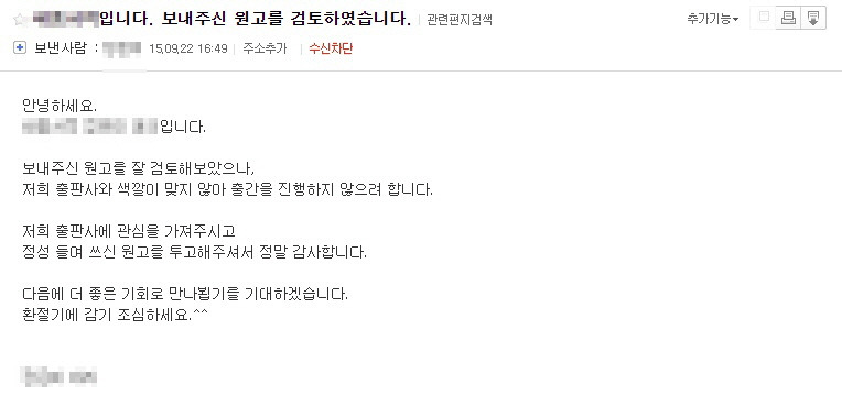 나의 메일함에는 몇십통의 원고거절 메일이 쌓여가기 시작했다.