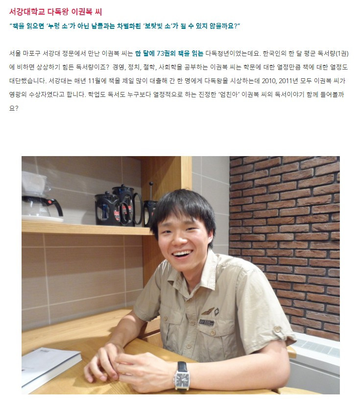 저는 대학을 다니는 동안 정말 닥치는 대로 책을 읽었습니다. 학교 도서관 직원분들도 저에 대해서 모두 알고 계셨을 정도였으니까요. 한달에 한번은, 제일 마지막 주 토요일에 24시간 열람실에서 책을 수북히 쌓아놓고 밤새 읽기도 했고요. 텅빈 열람실에서 밤새 읽고 싶은 책을 읽는 즐거움은 정말 그 무엇과도 바꿀 수가 없습니다. 크리스마스 이브 날이었던가요? 그날은 나름 크리스마스를 기념한다고 비싼 연어초밥을 사다놓고 새벽에 달을 보며 책을 읽다 야참으로 연어 초밥을 먹었는데 아직도 그 맛을 잊을 수가 없네요. 암튼 저는 그렇게 책을 읽으면서 20대를 보냈습니다. 그 결과 2010, 2011, 2012년 도서관장님으로부터 최다독자상을 받게되었는데 개인적으로 학교 졸업장보다 더 자랑스럽게 생각하고 있습니다. 3년 연속 1위는 독보적이잖아요? 조금은 자부심을 가지고 있기도 하고요. 다른 친구들과는 다른 뭔가를 만들어낸 결과물이라고도 할까요? 그래서 더 특별하게 느껴지는 것 같습니다. 암튼 수없이 많은 책을 읽으면서 보낸 것, 다른 친구들이 토익공부에 몰두할 때 제가 하고 싶은 것을 했다는 것. 이것은 제 대학생활을 다른 사람들의 대학생활과 구별지을 수 있는 가장 큰 일이 되었습니다.