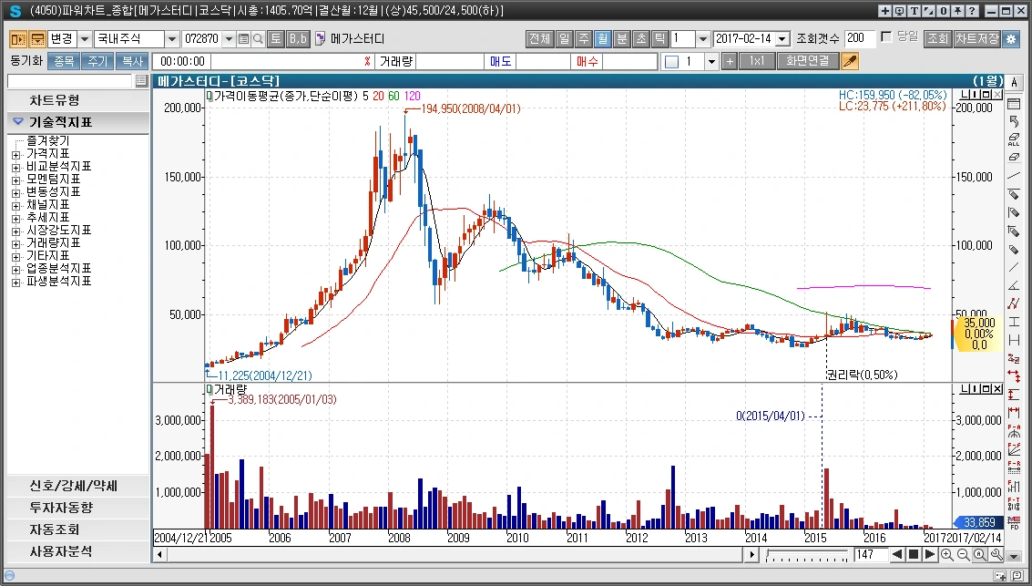 당시 메가스터디 주가를 나타낸 차트이다. 내가 주식을 시작해서 메가스터디를 매수한 시점은 2007년 설이 막 지난 시점이었다. 메가스터디의 차트를 보면 이미 메가스터디는 2005년부터 가파른 상승세를 타고 있었고 2008년 글로벌 금융위기가 터지기 전까지 주가는 20만원에 다다를 정도로 치솟았다. 재무제표 하나도 볼줄 모르는 생초보의 상태에서 매수한 종목이었지만 선택은 탁월했고 꽤 괜찮은 수익을 올릴 수 있었다. 아마 이때의 즐거움이 주식투자를 지금까지도 하게 한 것이 아닌가 싶다.