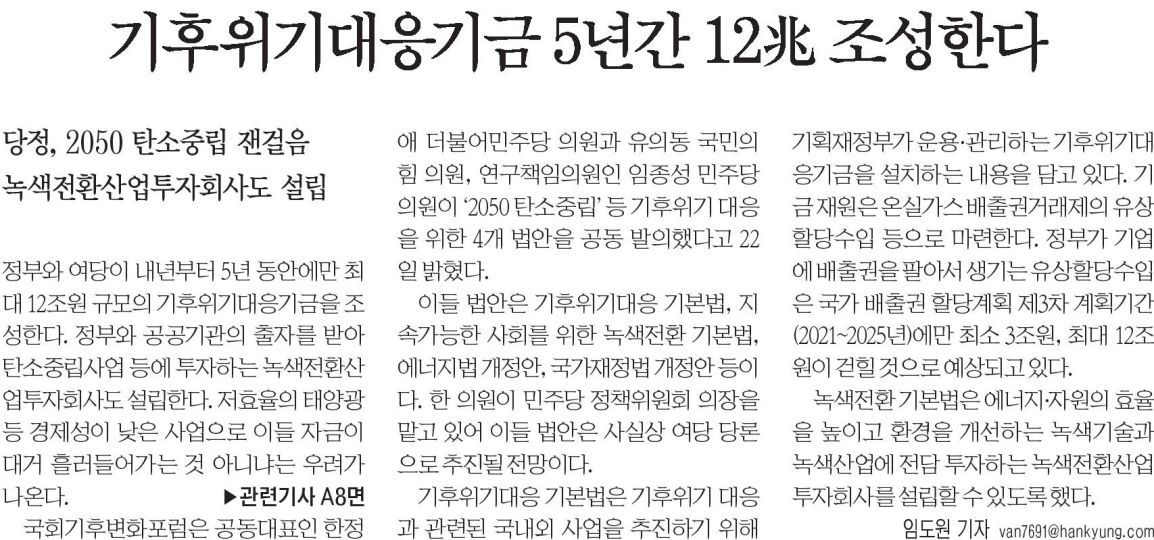 문재인 정부에서는 친환경 에너지에 많은 힘을 쏟고 있다. 그래서 태양광과 같은 대체에너지에 많은 투자가 일어나고 있다. 대체에너지에 대한 투자를 하는 것은 좋은 일이지만, 과정 속에서 여러가지 문제도 생기는 것 같다. 미세먼지, 기후변화 등 다양한 환경 문제가 발생하고 있는 현실에서 친환경 에너지 기술이 빨리 발달해서 더이상의 기후위험은 사라졌으면 한다. 투자를 하는 사람이라면, 대체에너지 쪽의 기업들을 눈여겨 봐도 좋을듯.