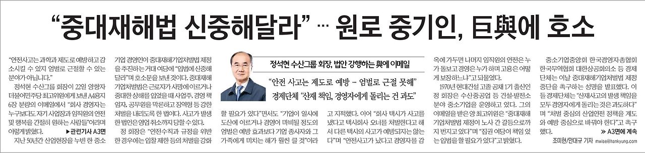 기업이슈에 중대재해법이 뜨거운 감자다. 회사측과 노동자측의 입장차이가 분명한 법안인데, 하루에 7명씩 노동자가 작업현장에서 사망하고 있는 현실을 막아보자는 취지의 법안이다. 현재도 산업안전보건법이 있지만, 위반을 하더라도 대부분 벌금형이나 집행유예로 끝나버리는 것이 현실. 이런 약한 처벌때문에 노동자들의 사망이 끊이지 않는다고 생각하는 것이다. 그래서 노동자와 진보정당 측에서는 현행법보다 훨씬 강력한 책임자 처벌이 담긴 중대재해법을 제정해야 노동자들의 사망이 줄어들 것이라고 이야기한다.