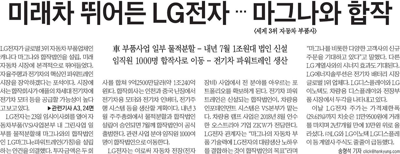 어제 LG 전자의 주가를 상한가까지 올린 이유이다. 전기차 시대는 이제 시간문제인 것 같다. 기존의 자동차 업계에서만 전기차를 고민하는 것이 아니라 이제는 전자를 다뤘던 기업들까지 속속 전기차 시장에 진입하고 있다. 스마트폰처럼 전기차도 하나의 전자제품이 되어가고 있다. 세계3대 IT박랍회중 하나인 CES2020 전시장에서 IT기업들이 차한대씩 가져다 놓고, 자동차 기업들은 도시를 짓겠다고 이야기한 것이 기억 난다. 더이상 자동차가 탈것이라는 생각은 이제 버리자. 우리가 지금 손안에서 전화는 물론 음식주문, 은행, 주식거래, 교육, 전자상거래 등 못하는 것이 없듯이 이제는 자동차에서도 이 모든 것이 이뤄질 전망이다. 자동차 자체가 하나의 플랫폼이 되는 것이다. 그런 시대가 정말 이제 코앞으로 다가왔다.