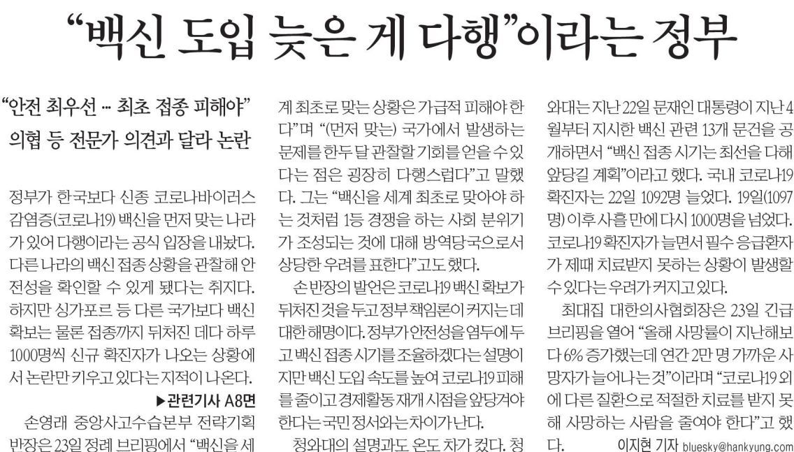 정부가 한국보다 코로나 백신을 접종하는 나라가 있어서 다행이라는 입장을 내놨다. 신문에서는 도입이 늦은 것에 대한 정부의 변명처럼 기사를 썼지만, 개인적으로는 정부의 입장에 동의한다. 신약이다보니 부작용이 걱정이다. 어떤 위험이 있을지 모르는데 마치 국민들을 대상으로 실험을 하는 건 굉장히 위험하다고 생각된다. 물론 백신 확보는 제대로 하지 못한 것은 문제지만, 또 그렇다고 최초접종을 하는 것도 부담스러운 것도 사실.