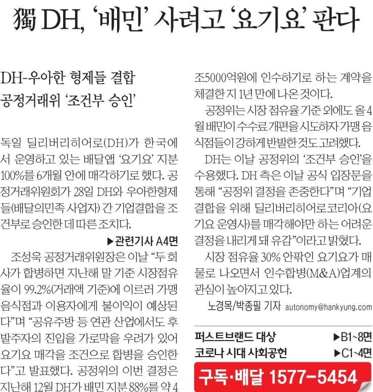 배달의민족과 요기요를 합치면 우리나라 배달시장에 정말 엄청난 영향을 미치는가 보다. 공정거래위원회에서 요기요를 팔라고 요구할 정도이니 말이다. 안그래도 배달의 민족이 독일기업에 팔린 후, 수수료 문제로 말이 많았는데 이번 요기요 매각을 통해서 배민과 요기요간에 건강한 경쟁을 했으면 좋겠다. 그 경쟁의 결과가 결국 소비자와 음식점주에게 혜택으로 돌아올 것이기 때문이다. 우리나라의 튼실한 기업이 요기요를 인수해서 우리나라 배달시장이 해외기업의 손에 좌지우지 되지 않았으면 하는 마음이다.