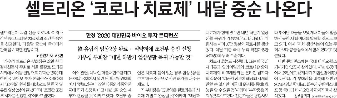 - 셀트리온 코로나19 치료제 조건부 승인 신청