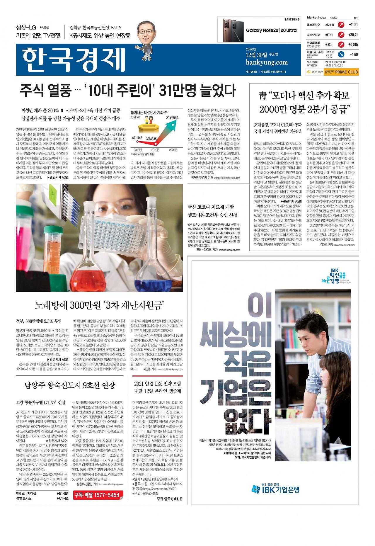 2020년 12월 30일 수요일 경제신문1면읽기 입니다.