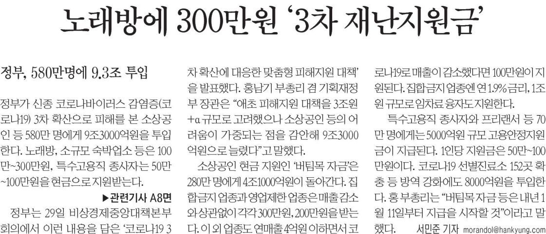 그동안 코로나19로 인해서 영업을 제한 받은 사람들에게 무조건적으로 지원을 하는 것은 좋아보인다. 엄청난 영업 피해를 감수하면서 정부의 정책에 따라준 소상공인들이 있기에 그래도 코로나19 위기를 이정도 선에서 버텨내고 있다고 생각한다. 물론 이들 지원금이 정말 한달 월세도 안될만큼 적은 금액이지만, 그래도 소상공인들이 쓰러지지 않게 아주 작은 버팀목이 되었으면 한다. 정부에서도 막연하게 현금을 살포하기보다는 다양한 정책들을 연구하고 만들어서 피해가 최소한으로 미치도록 노력했으면 좋겠다.