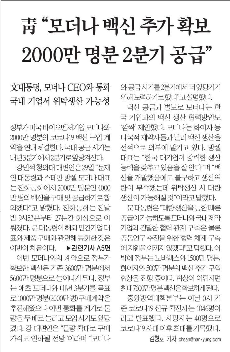 - 모더나, 한국기업과 백신 생산 협력할 듯
