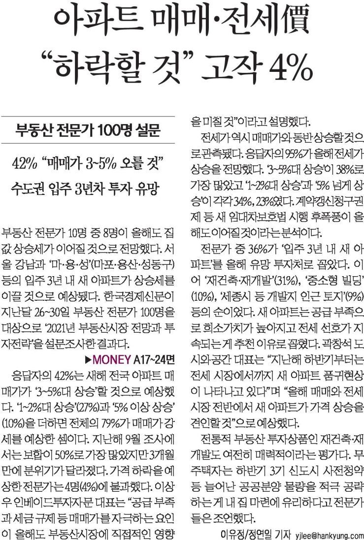 2021년도 부동산은 상승할 것으로 점쳐지고 있다. 전문가의 80%가 아파트 가격 상승을 점쳤고, 특히 입주 3년내 새아파트를 추천했다. 정부에서는 부동산 가격을 계속 잡으려고 하고, 여러가지 규제를 하고 있지만 시장에서는 오히려 반대로 작용하는 것 같다. 특히 정책에 있어 신뢰가 굉장히 중요한데, 문재인 정부는 부동산 정책에 신뢰가 많이 떨어져 정부의 정책이 더 효과를 받지 못하는 것 같다.