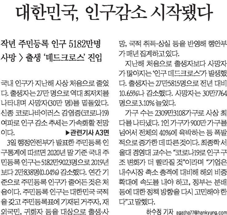 대한민국 인구감소 시작, 중대재해법 처벌 학교장 포함, 아파트값 상승전망