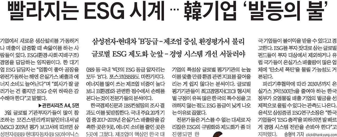 기업이 단순히 매출과 영업이익만 내면 되는 시기에서 이제 사회적 책임이 점점 높아져 가는 시대가 되었다. ESG도 마찬가지다. 기업을 평가할때 재무적인 요소뿐 아니라 비재무적인 요소로도 기업을 평가하겠다는 것이다. 기업의 사회적 책임이 높이 요구되는 상황이라고 할까. ESG가 낮다고 해서 벌금이 가해지거나 이런건 아니지만 전세계 금융기관에서 그 기업을 평가할때 좋지 않은 평가를 내릴 수 있다. 생존하기도 힘든 기업 입장에서는 ESG 중요하게 생각하지 않을수도 있겠지만, 함께 더불어 살아가는 사회라는 측면에서 좋은 기업은 좋은 사회를 만들어야 할 것이다. 그런 측면에서 ESG는 비재무적인 요소로서 중요한 평가기준이 아닐까.