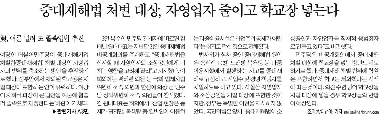 중대재해법. 그 의도는 좋으나 현실적인 적용은 쉽지 않은 법이다. 간단히 이야기하면 안전사고가 발생하면 사업주 및 경영책임자도 처벌할수 있게하는 법인데, 사고라는게 누가 일부러 내고 싶을까. 사고는 늘 조심해도 나기마련인데 사고가 나면 처벌을 하겠다니. 무서운 법이다. 적용도 무서운데, 대상이 되는 기준에 대해 자꾸 변화가 생기는 것 같다. 자영업자 범위는 축소시키고 학교장은 포함시킨다는 것이 이번 기사의 내용인데 최종법안은 어떤 모습일지 궁금하다. 학교장이 중대재해법에 갑자기 포함된 이유는 학원은 중대재해법이 적용되는데 학교는 왜 되지 않느냐는 지적때문인건 안 비밀.