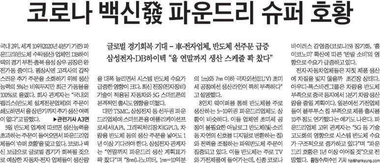 파운드리란 반도체의 설계 디자인을 전문으로 하는 기업으로부터 제조를 위탁받아 반도체를 생산하는 기업을 말합니다. 이런 파운드리 반도체 회사들이 지금 대호황이라고 합니다. 코로나 백신이 나오고 경제가 회복될 것으로 예측한 기업들이 주문량을 대폭 늘렸기 때문인데요. 국내 2위, 세계 10위 파운드리 업체 DB하이텍만 하더라도 올 상반기까지는 추가 생산할 여력 조차 없다고 합니다. 코로나가 종식되면 그동안 억눌려왔던 소비가 폭발할 것으로 예상되는데요. 무사히 코로나가 종식되어 경제성장도 폭풍성장했으면 좋겠습니다.