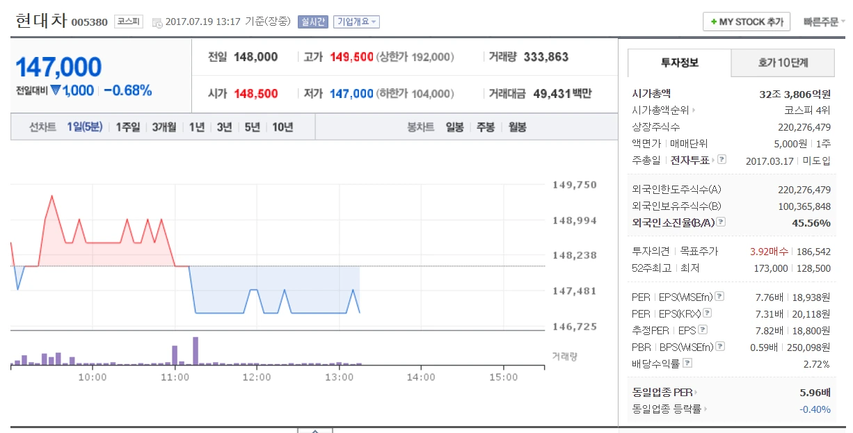 네이버에서 현대차를 한번 검색해보자. 현대차를 검색하면 기업에 대한 정보가 나오고 주식에 대한 정보도 나온다. (잘 모르시는 분은 이전글 PER 편을 찾아보면 어떻게 하는지 나온다)