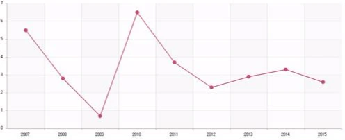 위의 표는 2007년부터 2015년까지의 우리나라 경제성장률을 나타낸 그래프이다. 2008년 글로벌 금융위기 사태를 고려하면, 경제성장률은 2-3% 수준에서 지속적인 하락세를 그리고 있다. 이러한 저성장기조를 두고 언론에서는 20년간 장기불황을 겪은 일본의 모습을 따라가는건 아닌지하는 우려도 있다. 실제로 2~3% 수준의 경제성장률은 2007년 이전과 대조하면 그 수치가 어느 정도 수준인지 더욱 쉽게 인식할 수 있다.