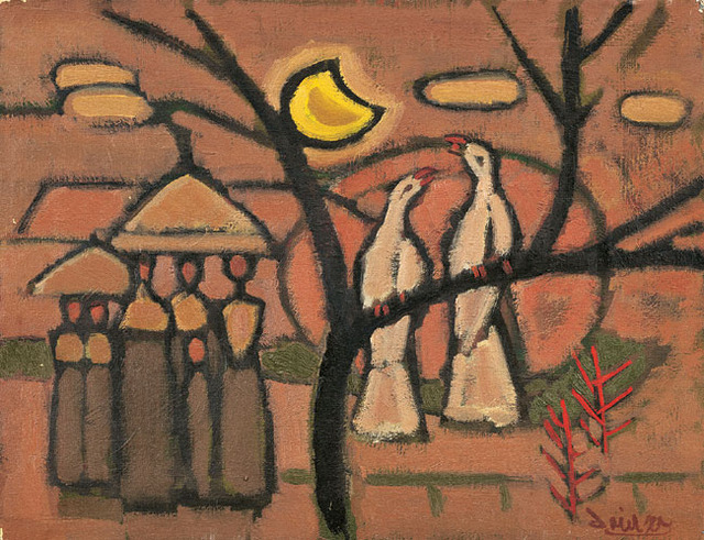전화황의 <나의 생가>를 보자. 평안남도 안주에서 태어나 제일조선인 화가인 그는 특히 향수 어린 고향을 그렸다. 한국전쟁과 분단으로 가족을 잃은 그에게 고향집은 그 고통 어린 향수를 그대로 체감하게 한다. 집에 드리운 검은 그림자, 그리고 그 집을 둘러싸고 있는 어둠과 폭력성이 작가의 생가 안으로 그대로 스며들어온다.