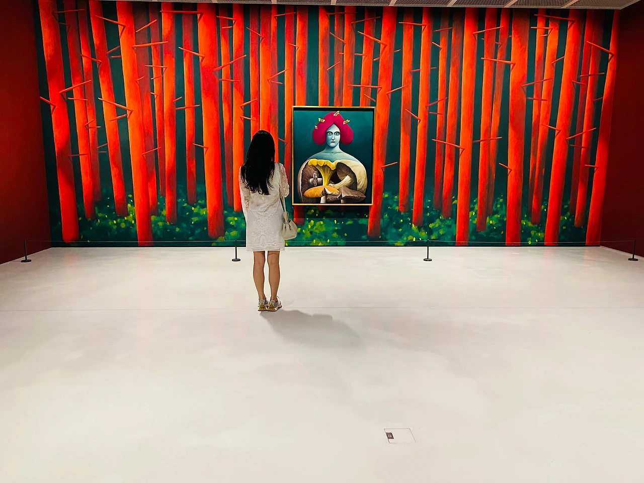니콜라스 파티에게 파스텔 벽화는 공간적 예술로 만드는 마법적인 장치로 쓰여왔다. 벽화로 공간성을 확보한 다음, 자신의 작품을 내거는 방식은 작품의 서사가 더욱 극대화시킨다. 버섯이 있는 초상>의 핏빛 나무 숲의 배경은 어둡고 축축한 곳에 서식하는 버섯을 나비와 병치시키면서 성장과 변형, 나아가 재창조를 도모하는 여성을 더욱 강렬하게 부각시킨다.