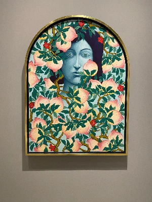 세속, 고통을 떠난 도교 신선들과 불로장생 신비의 과일 복숭아가 재현된 김홍도의 <군선도>. 파티는 <군선도>를 이번 전시를 위해 새롭게 제작된 8선의 초상화로 재해석했다. 장수의 상징인 복숭아로 둘러싸인 <복숭아가 있는 초상> 속 향긋하고 핑크빛 복숭아에 둘러싸인 생기 없는 무표정의 여성은 탐스럽고 아름다운 복숭아와 대비된다.