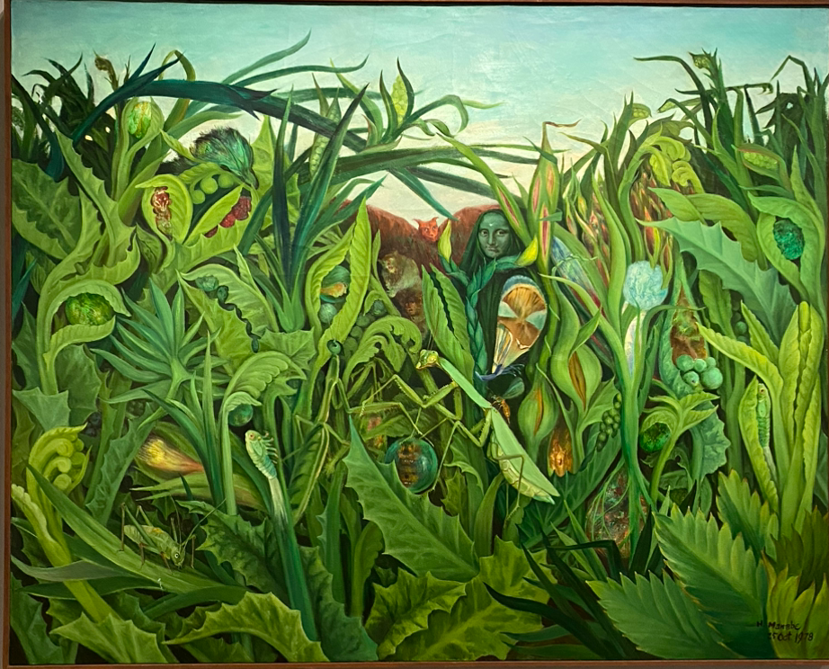그럼에도 최초로 한국에 소개된 그의 작품이 의미 있는 것은 외부에서는 '철저하게 일본인'으로 살았던 그가 작품에서나마 자신을 표출했기 때문이 아닌가 싶다. <새들의 산아 제한>에서 보호색 아래 숨어있는 동물, 웃고 있는 여성의 형상은 어딘지 모르게 섬뜩하고 기괴해서 눈길을 사로잡는다. 식물의 표현도 아름답다기보다는 무성하게 빽빽하고, '보호색' 안에서 무엇을 만날지 모르는 불안감을 자아내기도 한다.