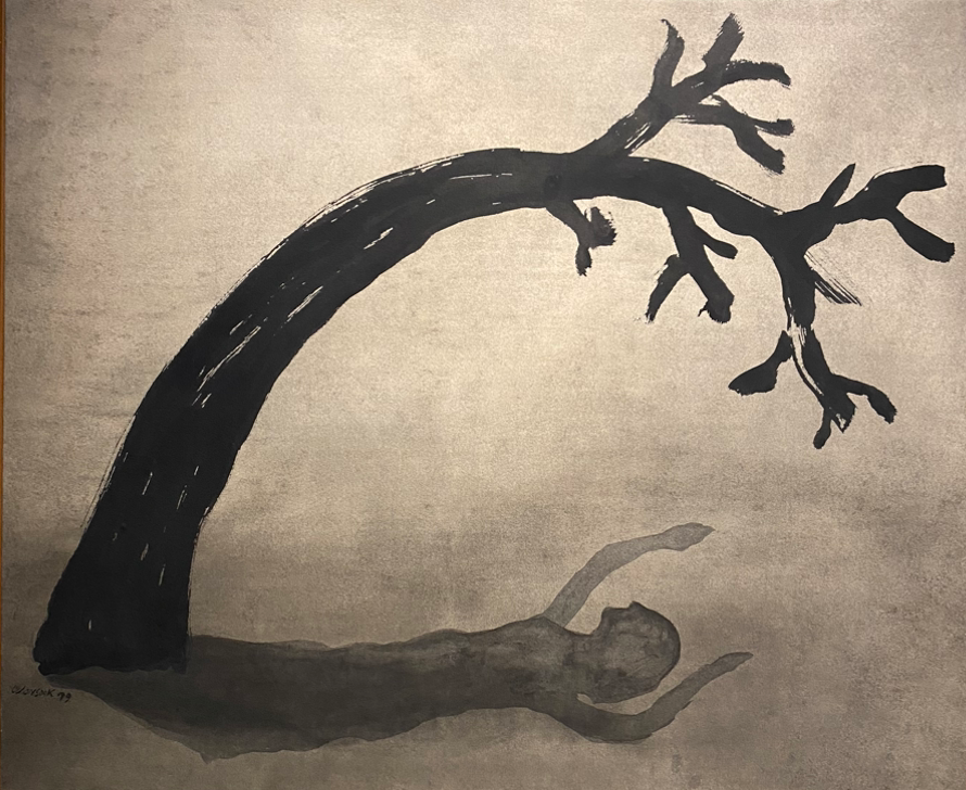 김원숙의 <나무 그림자>는 꿈에서나 볼 수 있는 상징적인 장면을 묘사하고 있다. 여성의 그림자가 나무의 뿌리로 그려져, 빛을 보지 못하는 여성 화가의 상징적인 자화상을 보여준다.