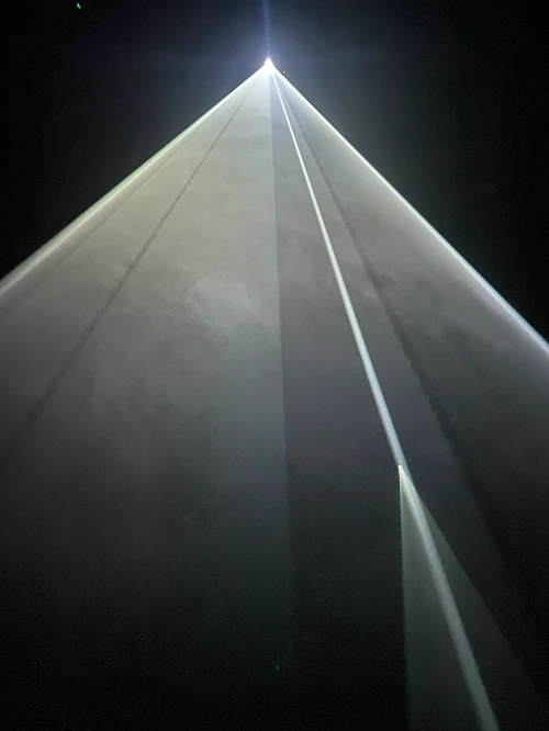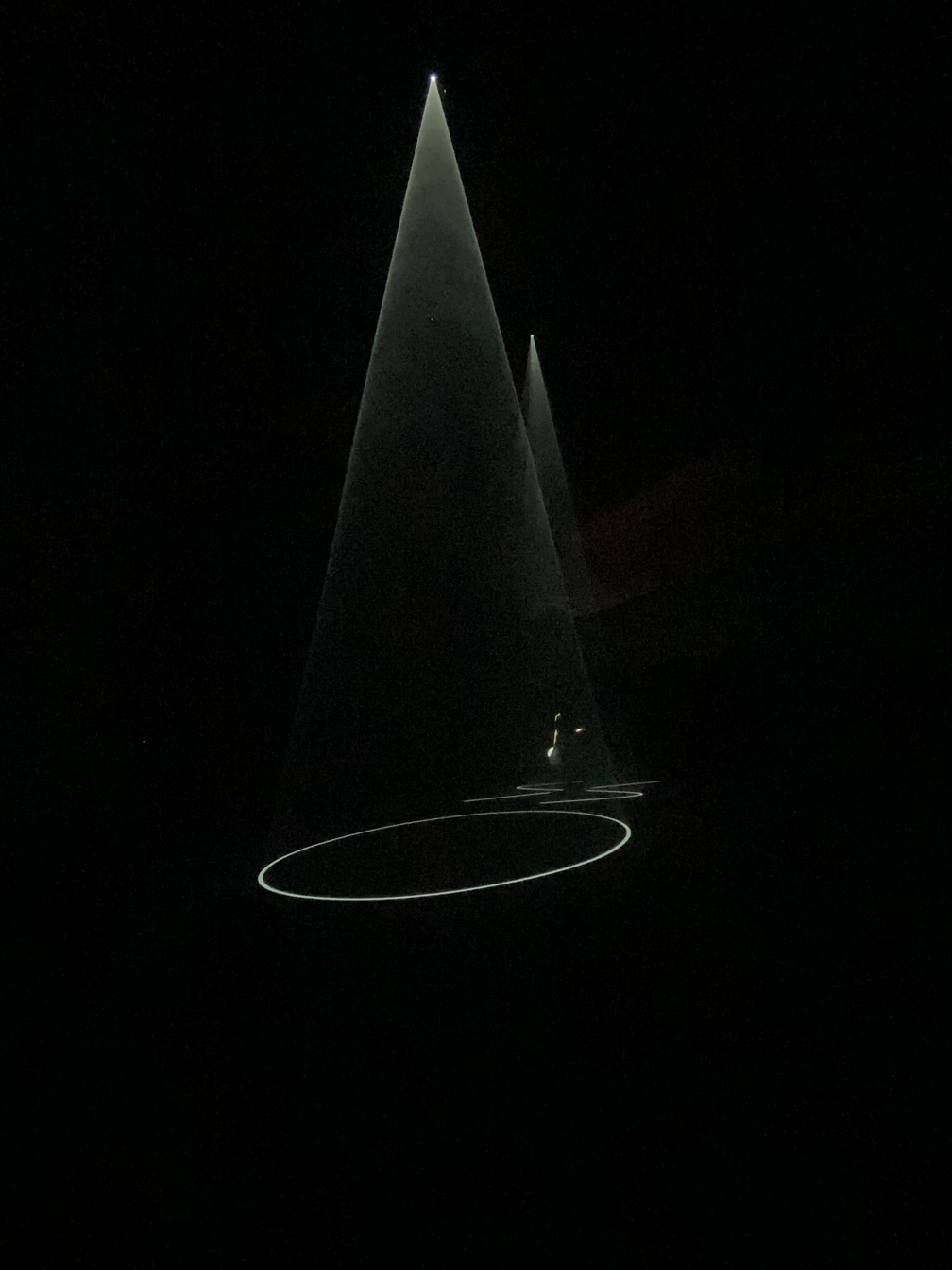 깊고 어두운 공간 속에서 저 멀리 높이, 달이 떠 있는 듯하다. 분사되는 안개는 밤공기와 바람 같이 느껴진다. 프로젝션은 고요히, 땅을 비춘다. 빛이 비치는 자리의 안과 밖은 공간을 나누지만 폐쇄적이지 않다. 빛의 경계를 왔다 갔다 하면서, 우리는 현대 도시의 삶에서 잊고, 빛과 어둠, 그림자를 온 존재로 인식한다.