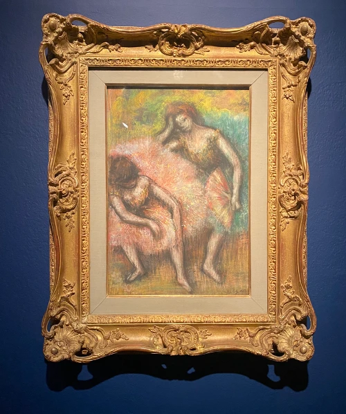 드가의 이 파스텔 작업은 마치 파스텔의 마법을 보여주는 것 같았다. 시력이 나빠지자 유화의 섬세한 작업을 할 수 없었던 드가는 본격적으로 파스텔화 작업을 했다. 이 작품은 특히 따뜻한 색감을 사용해 실내조명을 부각했고 파스텔 색을 혼합하고 긁어서 더욱 오묘하고 인상적인 색을 만들어간 과정을 엿볼 수 있다. 모네와 같은 인상주의 화가가 빛에 따라 변하는 찰나의 순간을 그려냈듯, 드가는 따뜻한 조명 아래 민첩한 발레리나들의 동작을 직관적으로 표현한다.