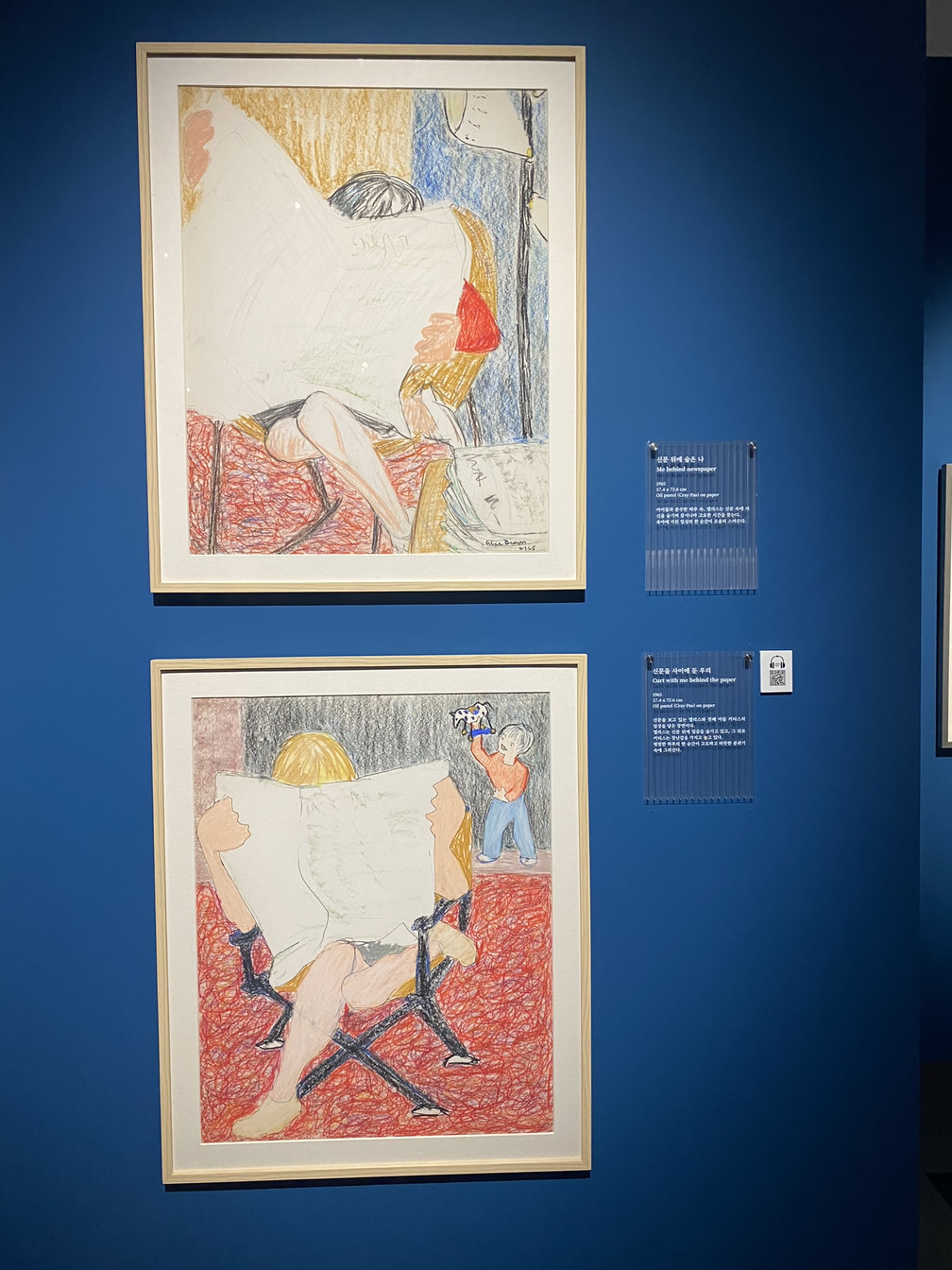 <신문 뒤에 숨은 나>와 <신문을 사이에 둔 우리>도 조금이라도 자신의 공간과 시간을 확보하고 싶은 간절함이 느껴진다. 잠시나마 고요한 시간을 가지고 싶지만 거칠게 칠해진 마룻바닥의 불안한 붉은색이 엄마의 감정을 느끼게 해 준다. 한창 육아와 예술을 병행하며 그린 미완성이거나, 아이들 미술도구인 파스텔로 북북 칠해져 그 현장성을 생생하게 전해 주고 있었다. 아마도 그림을 그리는 동안 세 아이의 요구를 들어주기 위해 끝없이 방해받고 침범당했을 거다. 그럼에도 불구하고, 그녀는 작업에서 손을 떼지 않았다.