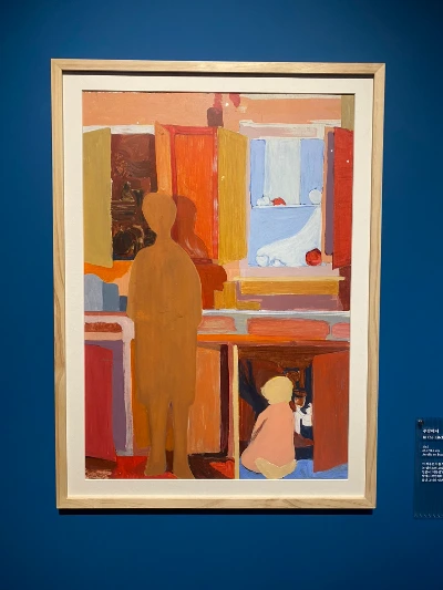 <주방에서>, 엄마는 우두커니 서 있다. 아무런 디테일 없이 그려진 엄마의 그림자는 매일 일상적으로 자신의 존재가 조금씩 지워져 가는 작가의 모습을 담은 듯하다. 설거지를 하던 중이었을 까. 조금이라도 엄마와 함께 있고 싶은 아이는 주방 아래 선반을 열어젖히며 놀고 있다. 2025년 작품에서 창은 바다로 향하고 더 넓은 세계로 향하는데, 이 엄마 앞에 열린 것은 어지러운 주방 펜트리일 뿐이다.