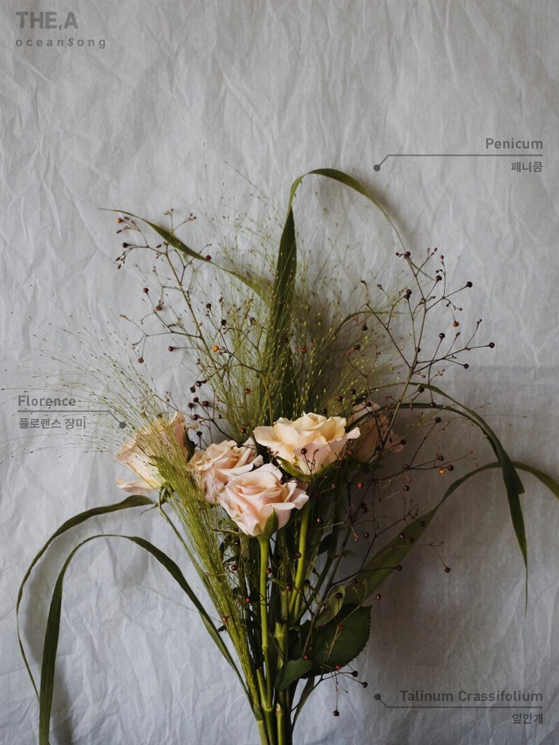 플로렌스장미는 연한 살구색이나 크림색을 띠며 꽃잎 가장자리가 말려있어 빈티지함이 큰 매력인 꽃입니다. 스프레이형으로 대 하나에 여러 줄기의 꽃이 피므로 크지 않고 오밀조밀한 것이 특징입니다. 드라이플라워로 말려서 빈티지한 느낌을 만들기도 합니다.