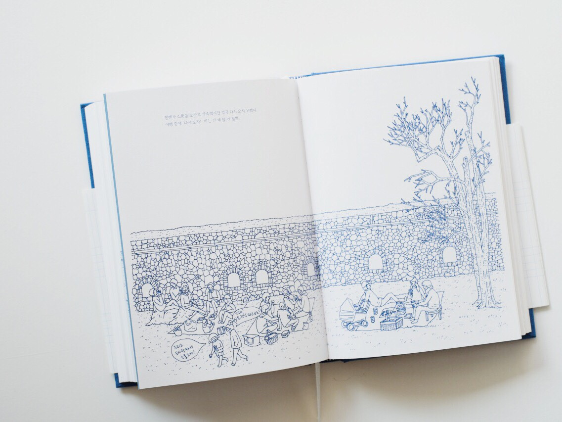 핀란드 국기가 하얀색 바탕에 파란 십자가예요. 파란색은 호수와 하늘을, 하얀색은 눈을 의미해요. 제가 파란색을 좋아하기도 하고요. 평소 작업에는 컬러가 조금씩 들어가는데, 기존 독자들을 위해 색다른 느낌을 찾으려고 노력했어요. 처음에는 까만 펜 드로잉에 파란색이 포인트 컬러로 들어갔었는데, 인쇄 직전에 파란 라인으로 바뀌었어요.