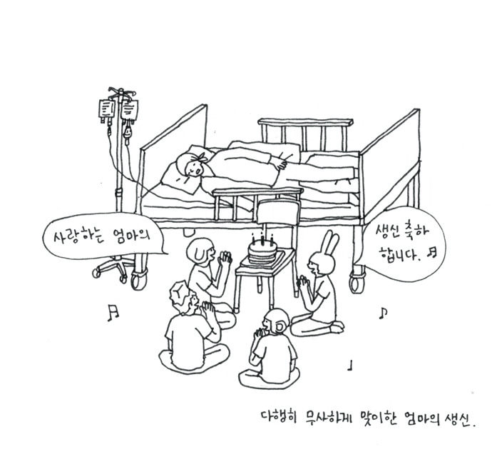 봄부터 엄마의 이야기를 그려야겠다고 생각했어요. 계속 마무리를 못 짓고 다듬기만 했는데, 이러다가는 엄마가 그림을 못 보고 가실 것 같은 거예요. 그래서 병원에서 그렸어요. 쉽지는 않은 일이지만, 모두 제 역사이고, 기억하고 싶은 순간들을 그릴뿐이에요. 솔이 이야기를 그리는 것과 같은 일인걸요. 포털 사이트에 올리는 게 신경이 쓰이긴 했지만, 예상 외로 공감해주시고 응원해주시는 수많은 댓글을 보면서 울기도 많이 울었고, 감동받았어요. 무엇보다 엄마에게 모두 읽어드릴 수 있어서 좋았어요.