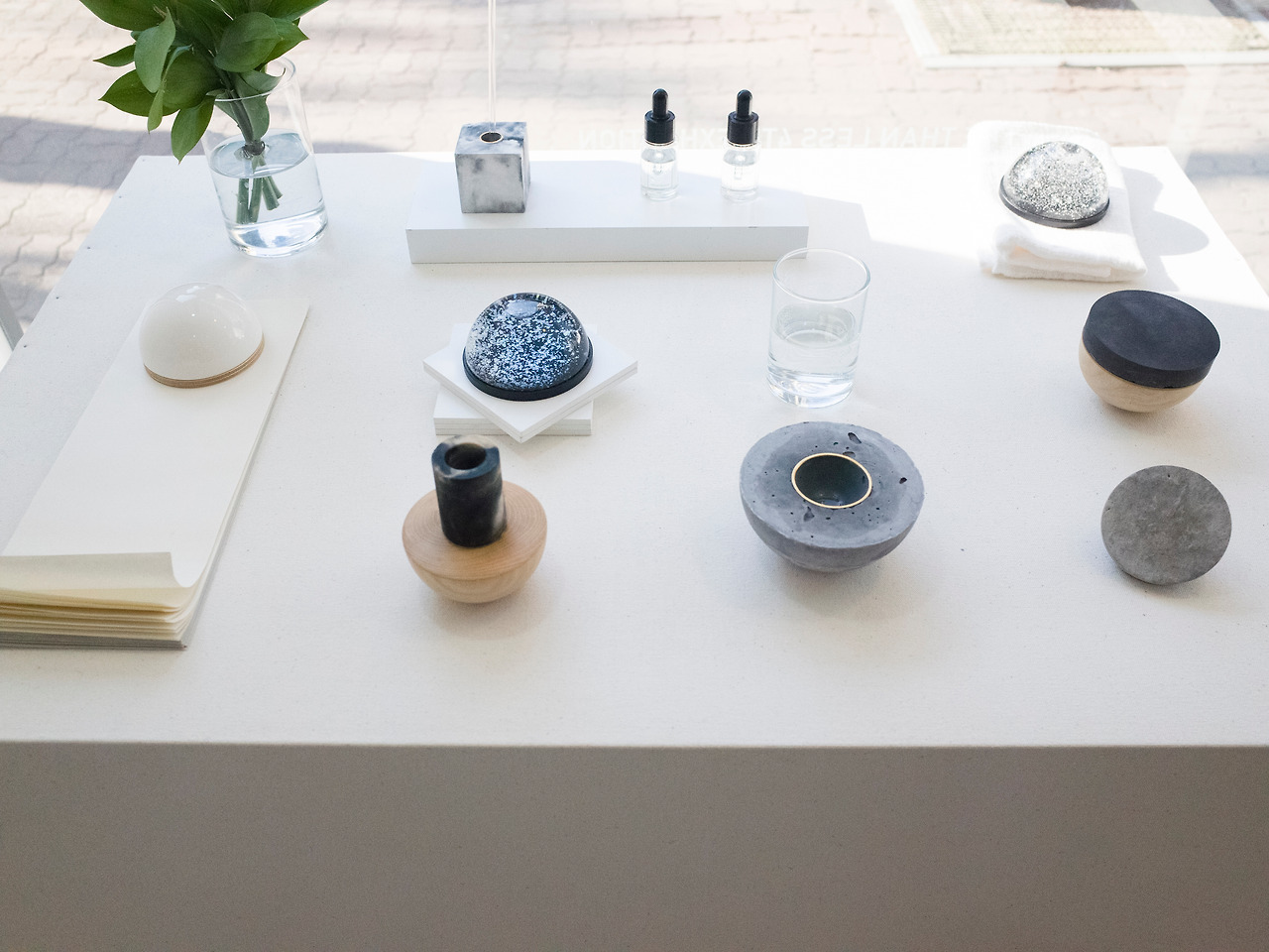 지금 하고 있는 게 네 번째 전시예요. 그레이트마이너와 [From the form]이라는 제목으로 전시하고 있어요. 형태 자체가 가진 기능을 찾아서 반구로 디퓨저, 문진, 거울 등의 제품을 만든 거예요.