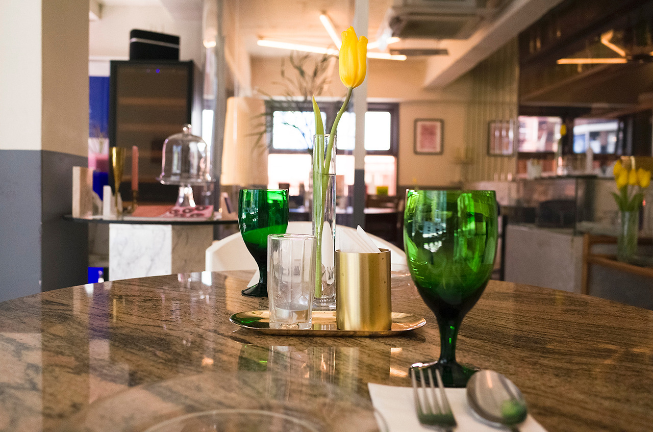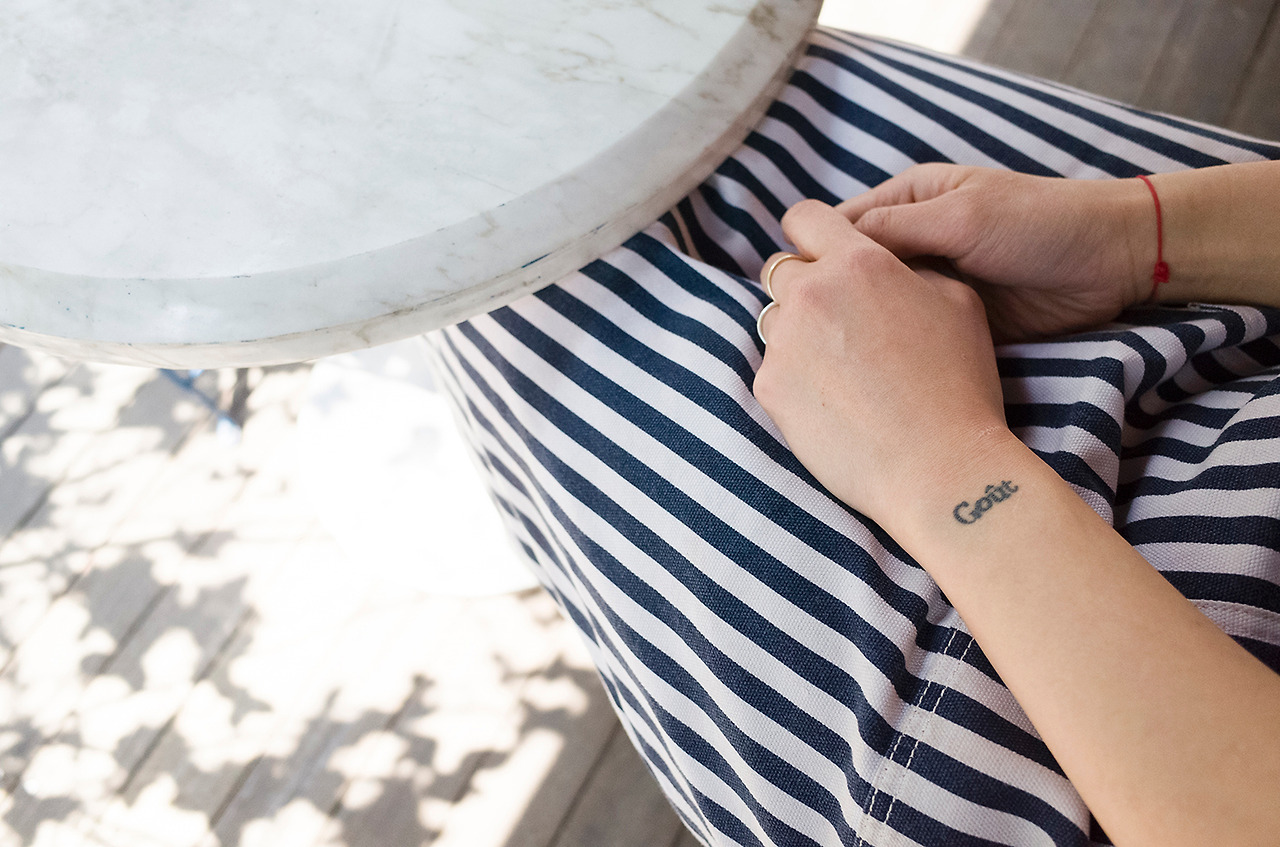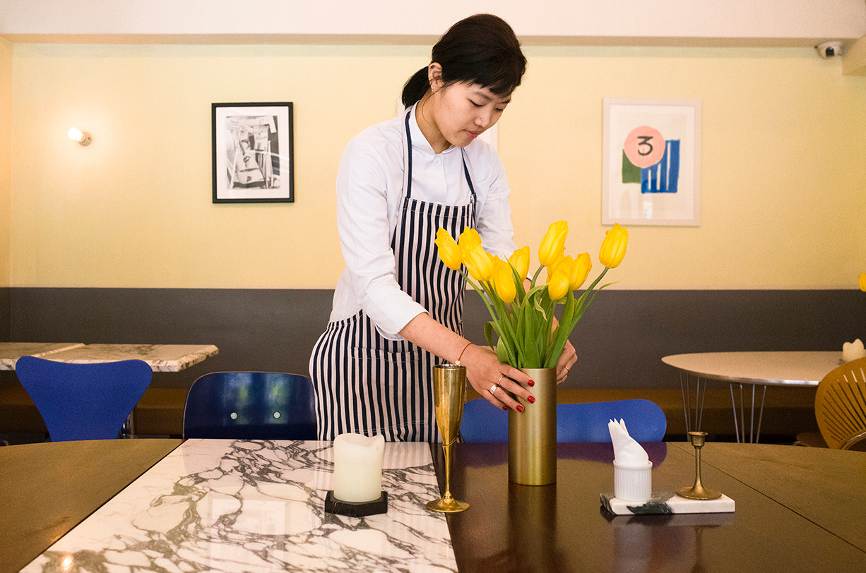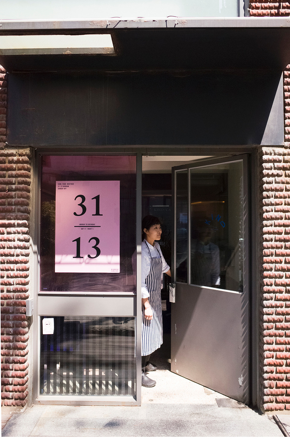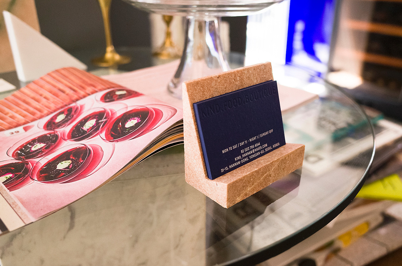 KIND by Yoo Jung In. 2016년 봄에 본 카인드는 파랑과 분홍의 빛, 대리석 조각들과 황동의 반짝임이 곳곳에서 묘한 세련미를 돋우고 있었다. 한남동의 터줏대감으로 자리 잡는 동안 수없이 변해왔을 공간의 지금이었다. 이 곳의 아침에 만난 유정인 셰프는 매일같이 출근하는 여느 직장인과 마찬가지로 화장기 없는 얼굴에 부스스한 머리를 질끈 묶고 따뜻한 커피를 한 잔 내려주었다. 그것이 오늘날 쉽게 볼 수 있는 유정인의 단면이었다. 하얀 조리복, 단정하게 묶은 머리, 그리고 손목의 다짐과도 같은 타투 goût(불어로 미각, 맛, 기호 등을 의미).