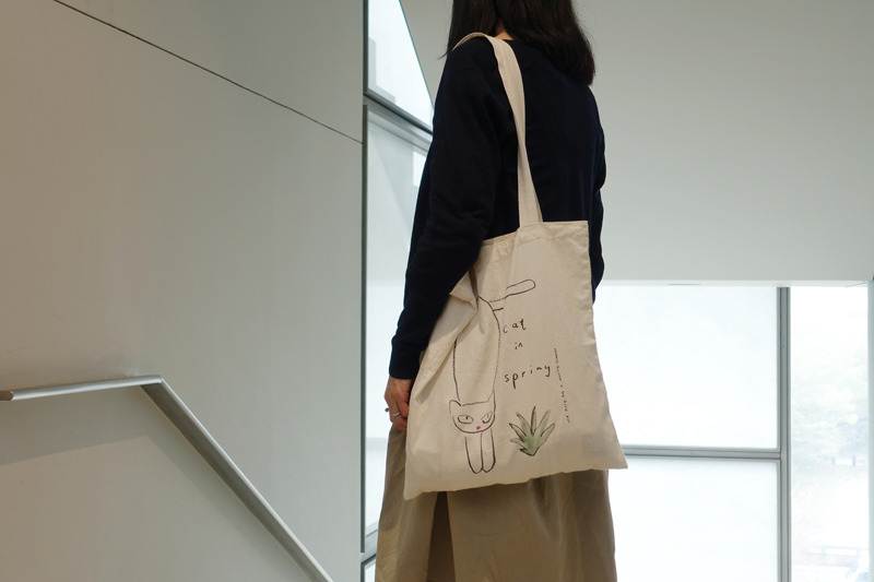 원모어백에서 고양이와 봄을 그린 그림으로 가방을 만들어보자는 제안을 주셨어요. 이런저런 궁리를 하다가 봄기운에 폴짝 뛰어오른 느낌의 고양이와 손글씨를 조합한 스케치가 나왔는데 마음에 들어 여러 장 그려봤어요. 그중 두 장의 그림이 가방으로 나오게 됐어요.