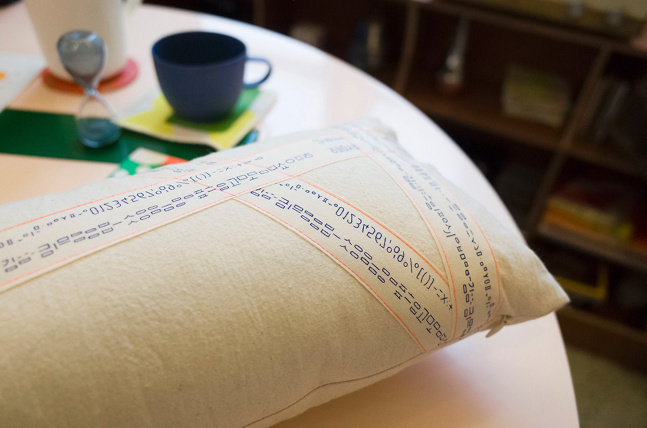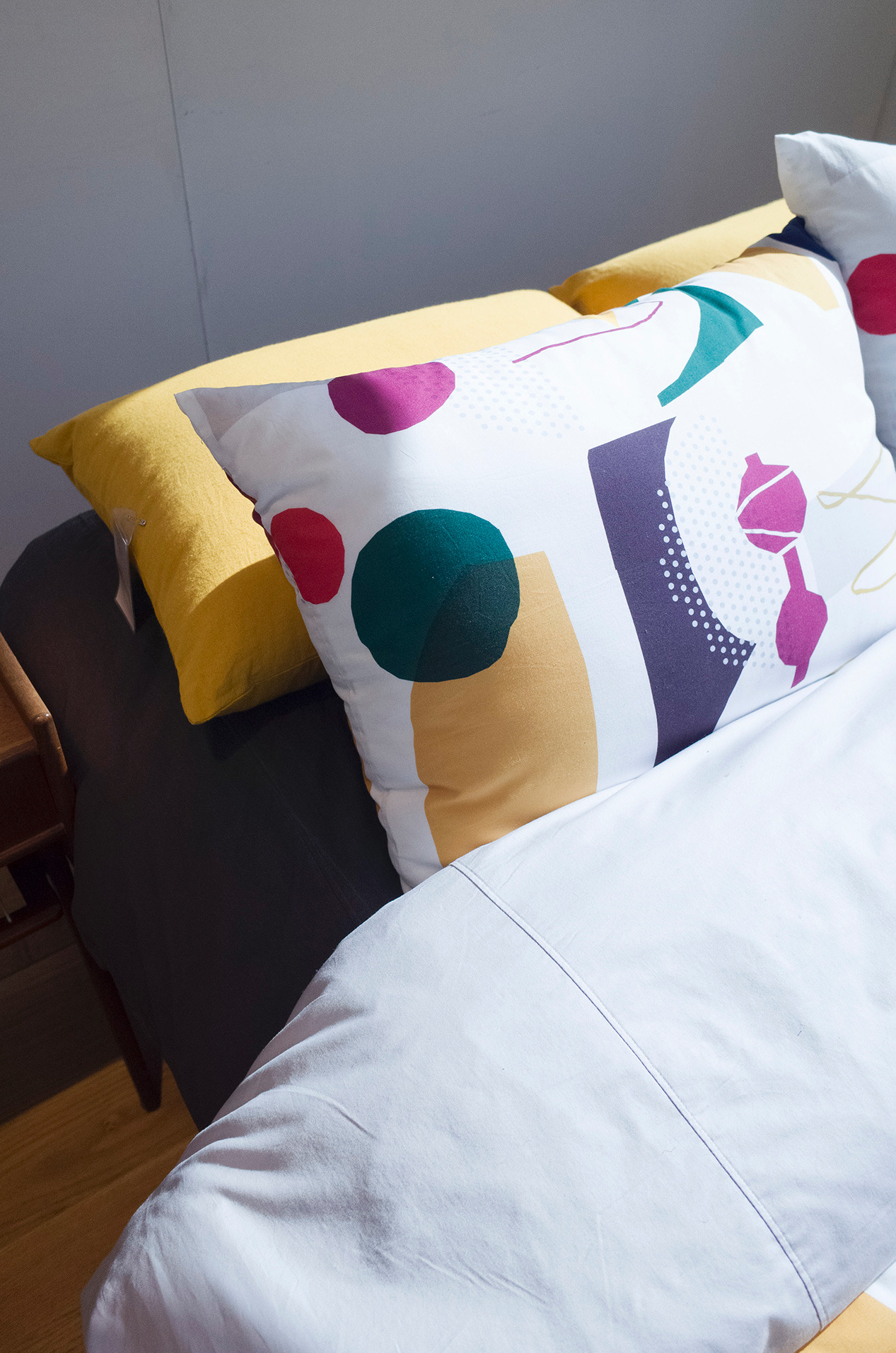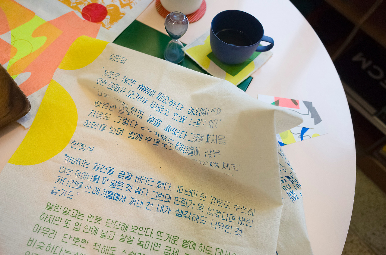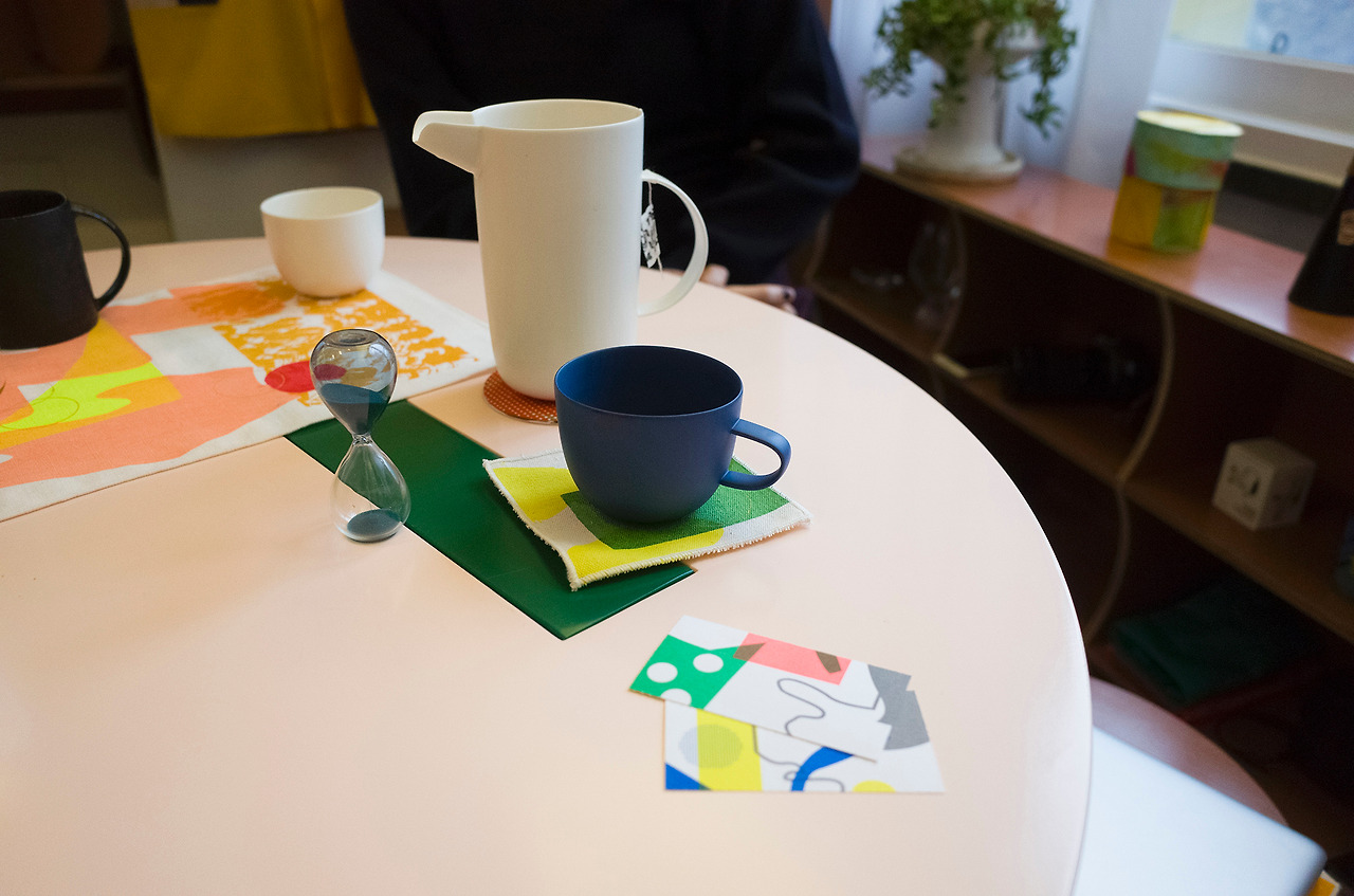 비가 오는 날의 쇼룸은 유독 더 하얀빛이었다. 캔버스 같은 공간을 식물과 햇빛의 흔적이 알록달록하게 메웠다. 살색 빛의 둥근 테이블에 옹기종기 앉아 따뜻한 느낌의 하얀 주전자에 뜨거운 차를 우려 얇고 매트한 네이비 머그잔에 따라 마셨다. 머그잔은 노랑, 초록 도형이 겹쳐진 작은 원단 코스터 위에 내려놓았다. 입구의 원단 행렬도, 여기저기 걸린 그림도, 인사하며 건네받은 명함 뒷면도, 무엇하나 똑같은 게 없었다. 안전한 무채색에 길들여진 감각은 밀려오는 색채와 도형의 자유로움에 위기를 느꼈다. 너무 많은 걸 잊고 지내왔다는 위기감을.