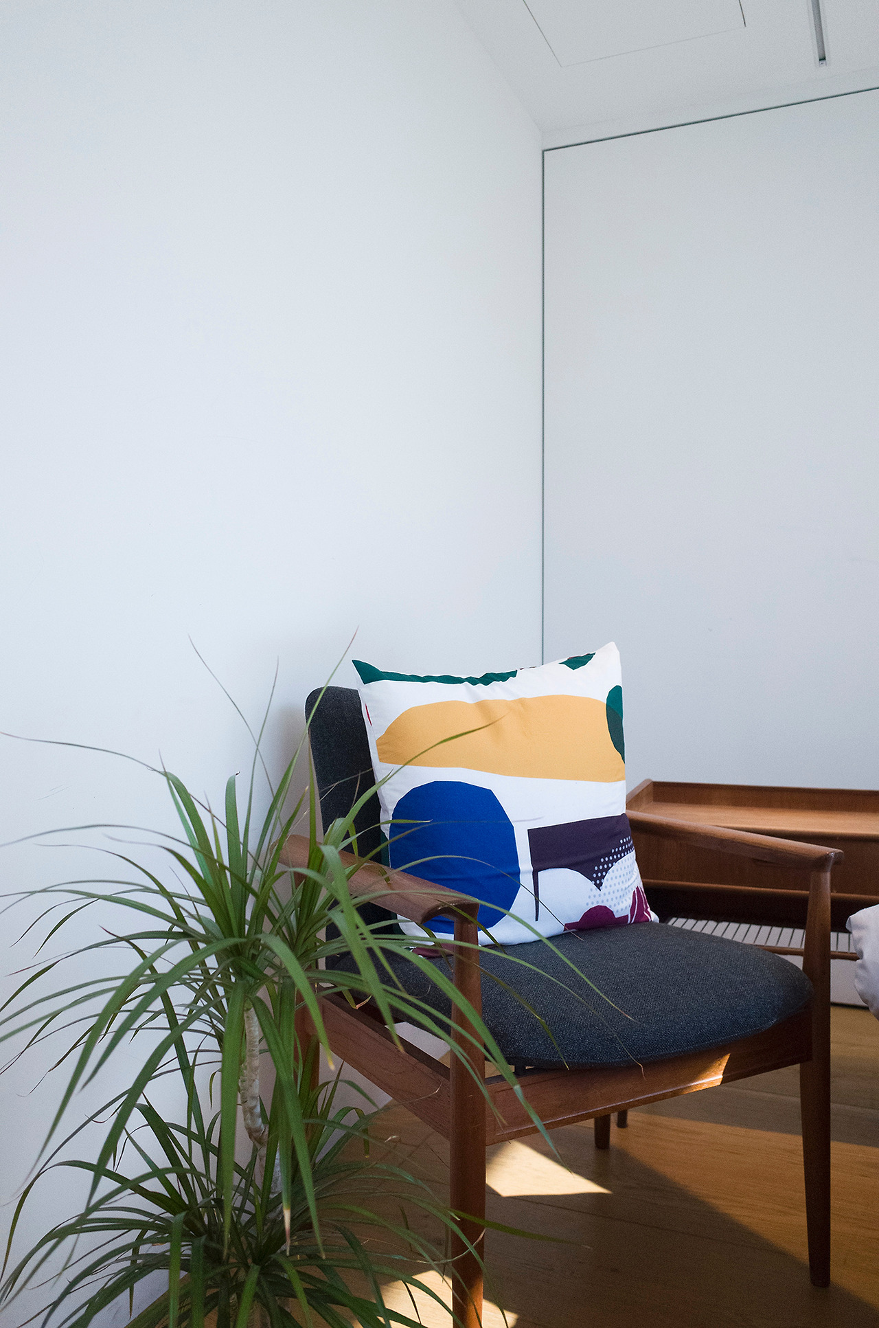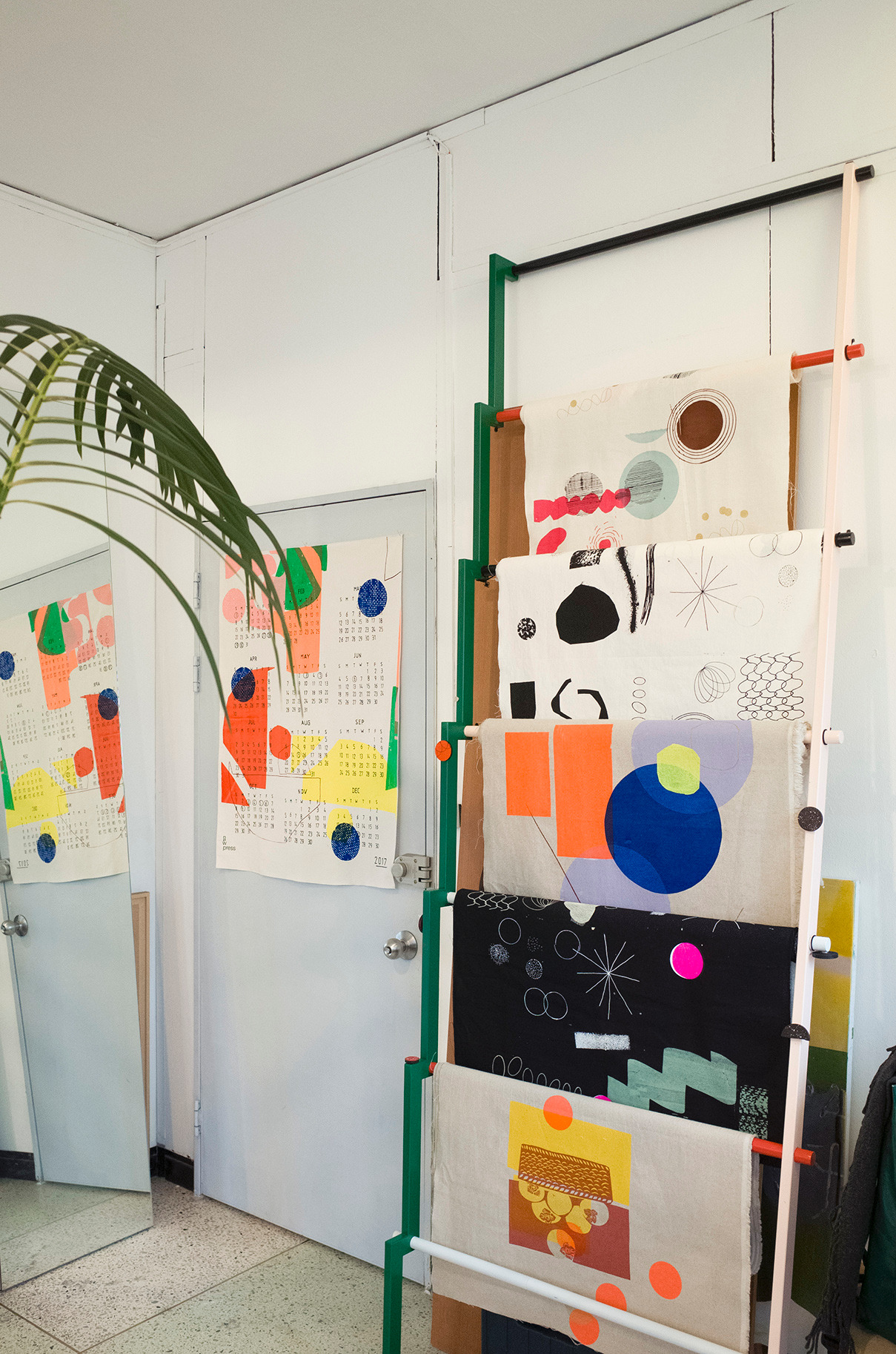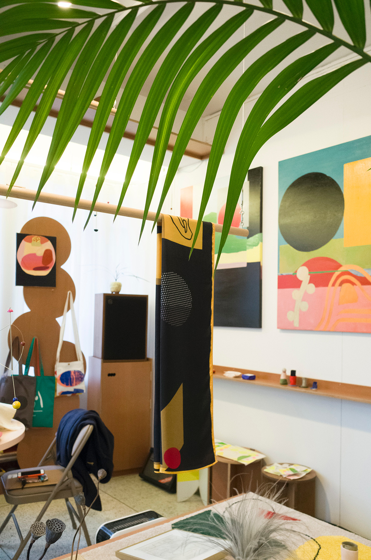 해가 중천에 뜨면 이 곳은 다시 패턴과 컬러가 가득한 실크스크린의 보물창고가 된다. 작고 네모난 공간을 가로지르는 기다란 이파리 사이로 노랗고 검은 스카프가, 뒤에서는 빙글빙글 도는 모빌이, 그 위와 옆으로는 종이를 이리저리 접은 듯한 조명과 이 모든 걸 대표하는 듯한 그림들이 하나씩 눈에 들어온다. 커다란 사다리에 차례대로 걸려있는 원단도, 창가에 놓인 패턴 아카이브 북도, 곳곳에 놓인 꽃병과 쿠션과 의자도, 모두 최경주 작가 손에서 태어났다. 덕분에 무엇 하나 뒤질 것 없이 뚜렷한 존재감을 내뿜는다.