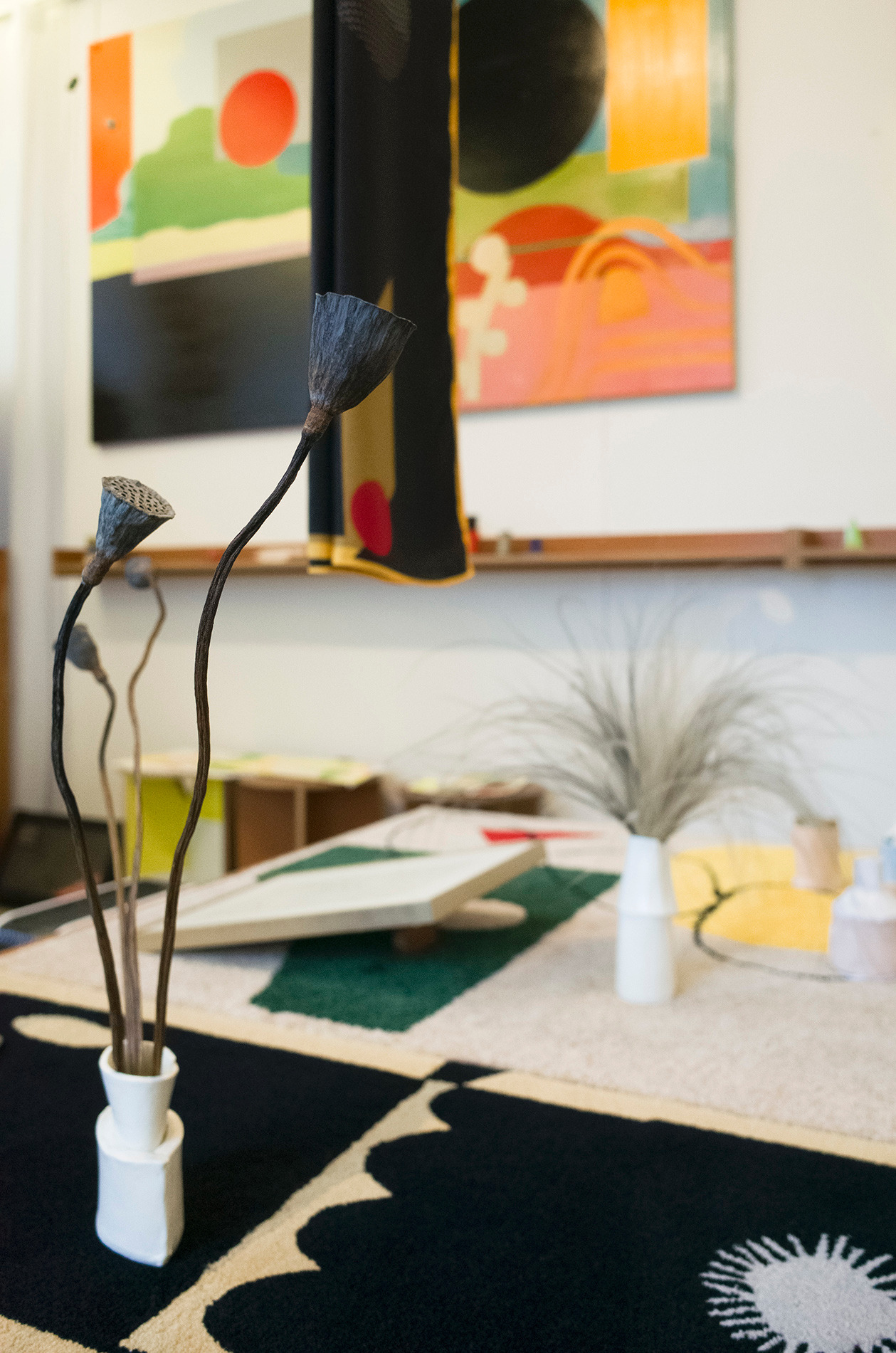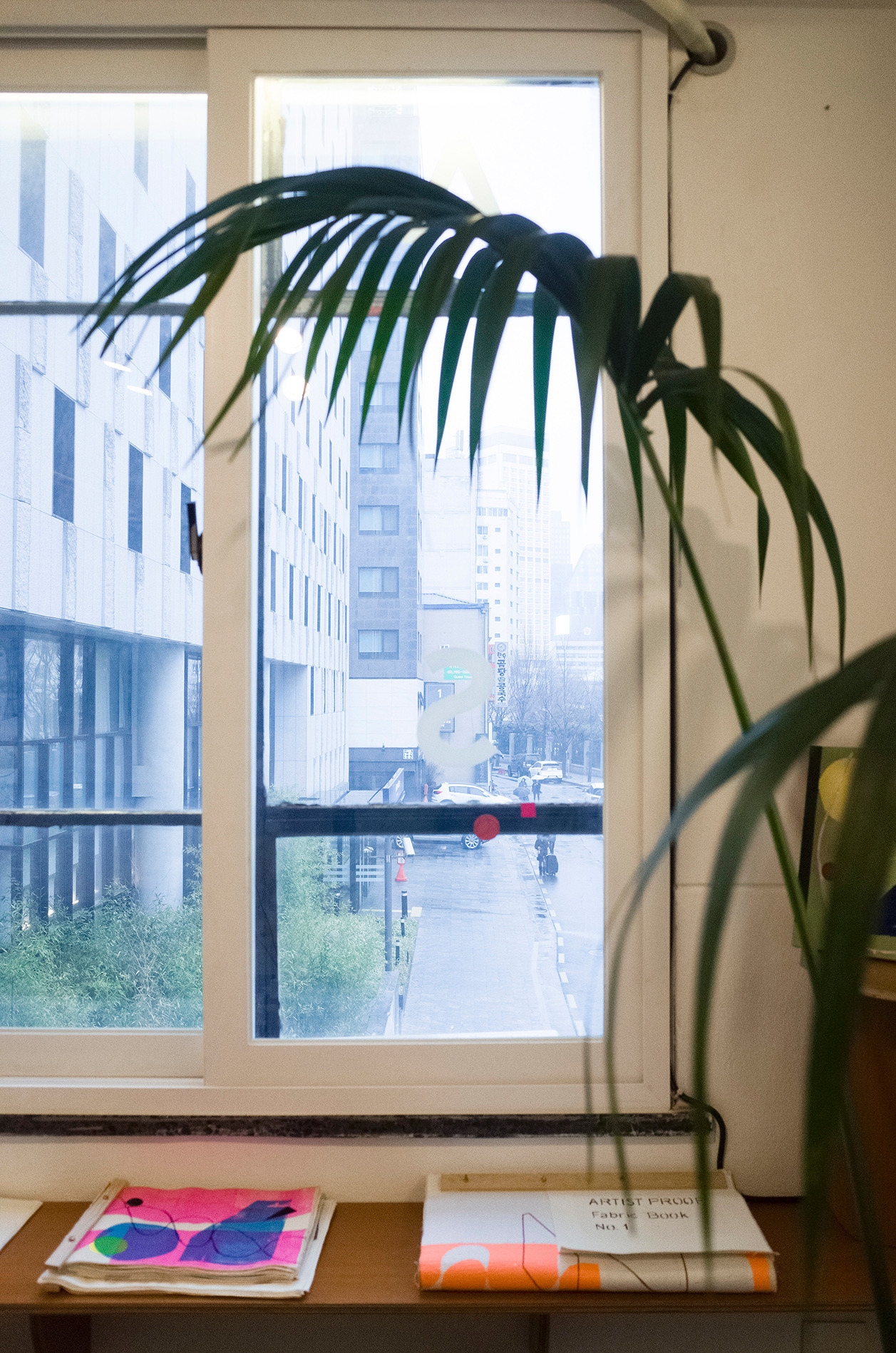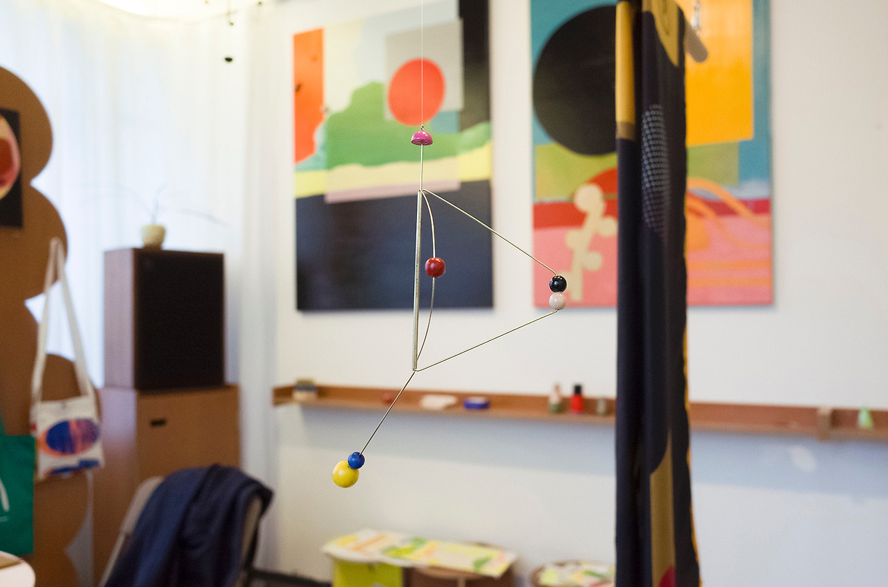 해가 중천에 뜨면 이 곳은 다시 패턴과 컬러가 가득한 실크스크린의 보물창고가 된다. 작고 네모난 공간을 가로지르는 기다란 이파리 사이로 노랗고 검은 스카프가, 뒤에서는 빙글빙글 도는 모빌이, 그 위와 옆으로는 종이를 이리저리 접은 듯한 조명과 이 모든 걸 대표하는 듯한 그림들이 하나씩 눈에 들어온다. 커다란 사다리에 차례대로 걸려있는 원단도, 창가에 놓인 패턴 아카이브 북도, 곳곳에 놓인 꽃병과 쿠션과 의자도, 모두 최경주 작가 손에서 태어났다. 덕분에 무엇 하나 뒤질 것 없이 뚜렷한 존재감을 내뿜는다.