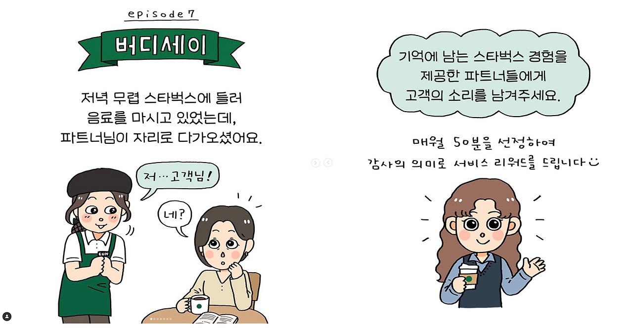 스타벅스는 실제 매장을 배경으로 고객과 임직원 사이의 에피소드(사연)를 받아 이를 콘텐츠로 재가공하고 있는데요. 다양한 에피소드를 시리즈 콘텐츠로 발행하며 친근함과 함께 공감을 이끌어 내고 있습니다. 이렇듯 우리 브랜드 내에서 일어난 사연 등을 공유하는 것은 휴머니즘을 더해 브랜드의 호감도를 높이고 있는 콘텐츠 유형입니다.
