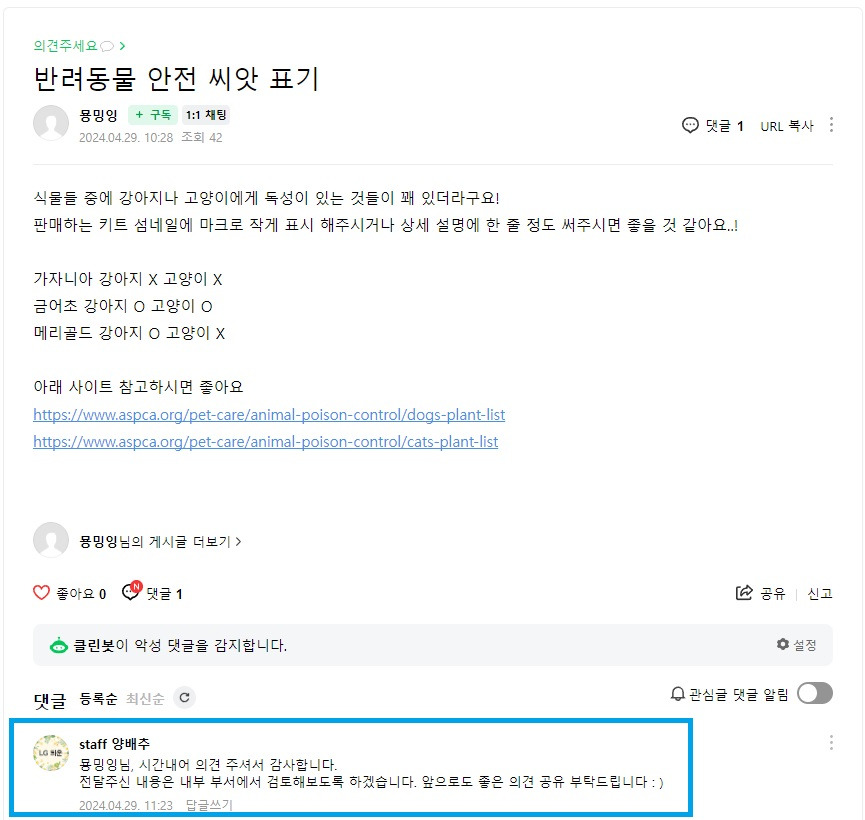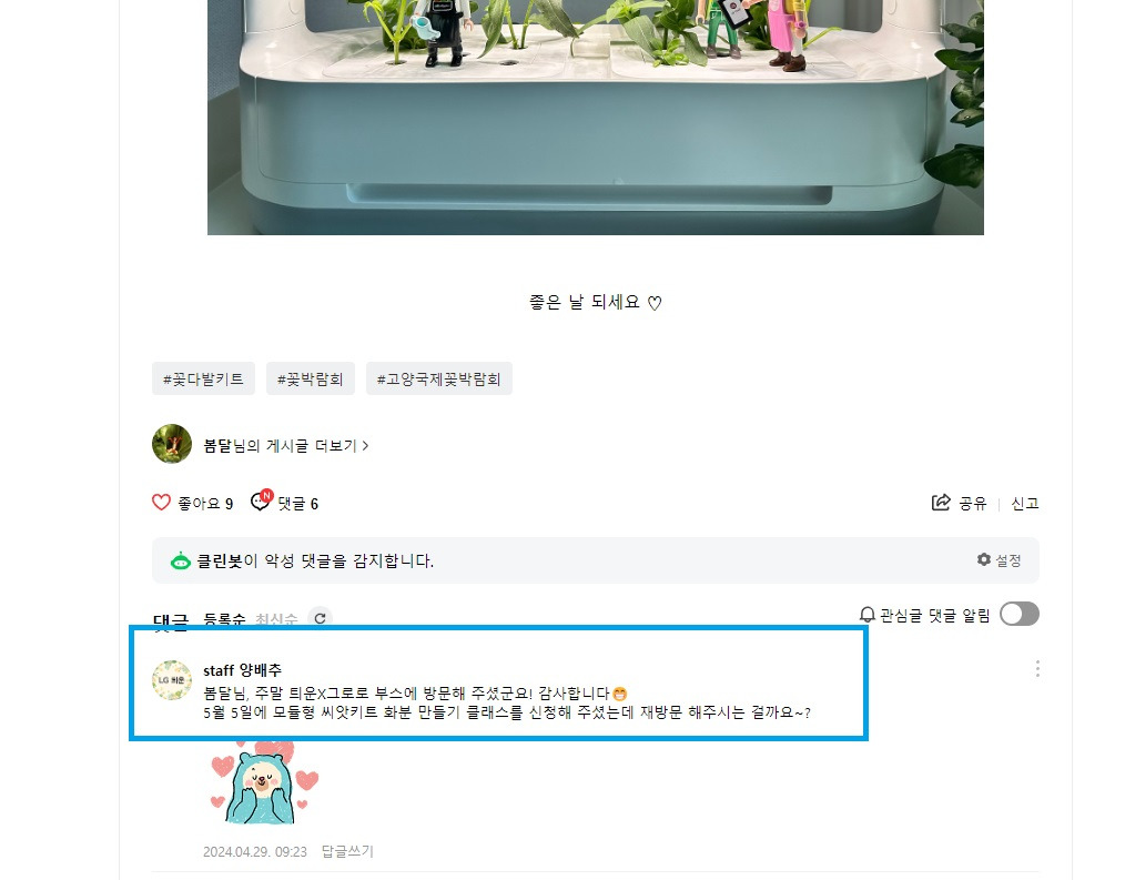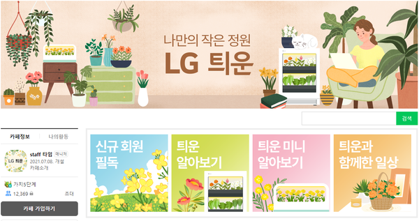 반려식물과 관련된 '알아두면 쓸모 있는 식물 잡학사전'등 정보 공유는 물론 LG전자 사내독립기업 직원들이 이곳에서 틔우너(카페 회원)의 목소리를 적극 들으며 열심히 소통하고 있는 것이 특징입니다. 또한 출시되지 않는 씨앗을 함께 키워보는 '가틔 이벤트' 등 찐 팬의 꾸준한 활동을 도모할 수 있는 다양한 프로모션도 곳곳에 배치한 것이 특징입니다.