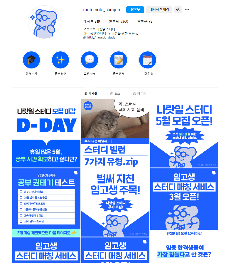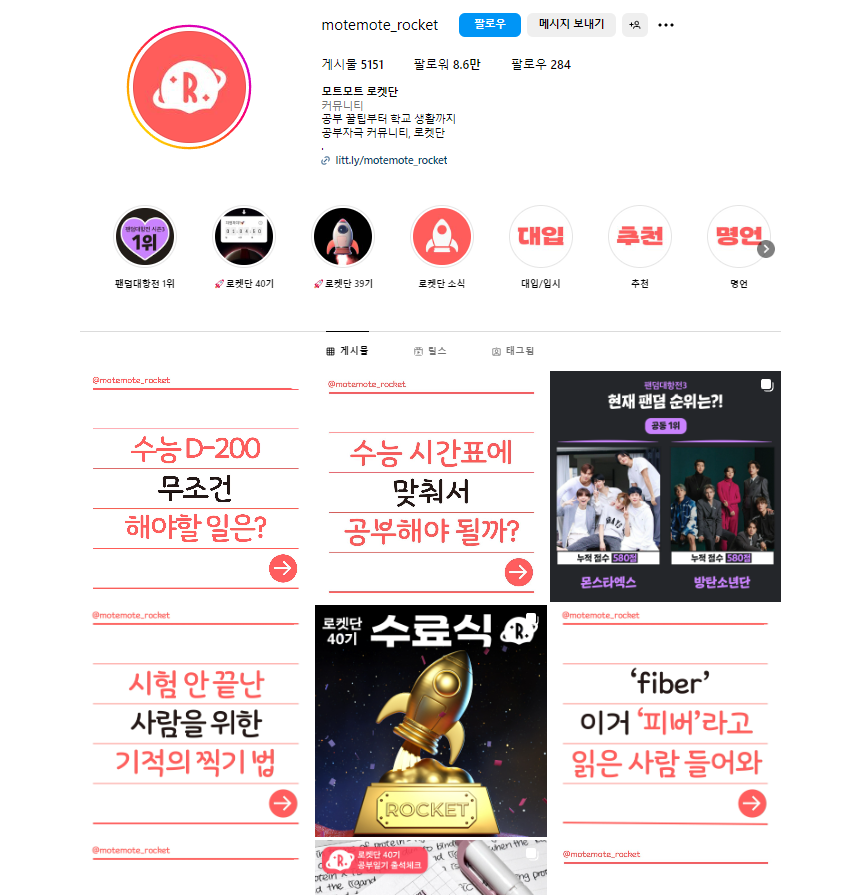 또한 오피셜계정뿐 아니라 로켓단, 나랏일스터디 등 공부 테마별로 공감할 수 있는 사용자들을 이끌고 이들이 원하는 콘텐츠 즉, 수요자가 원하는 콘텐츠를 지속적으로 발행하고 있는 것이 특징입니다.